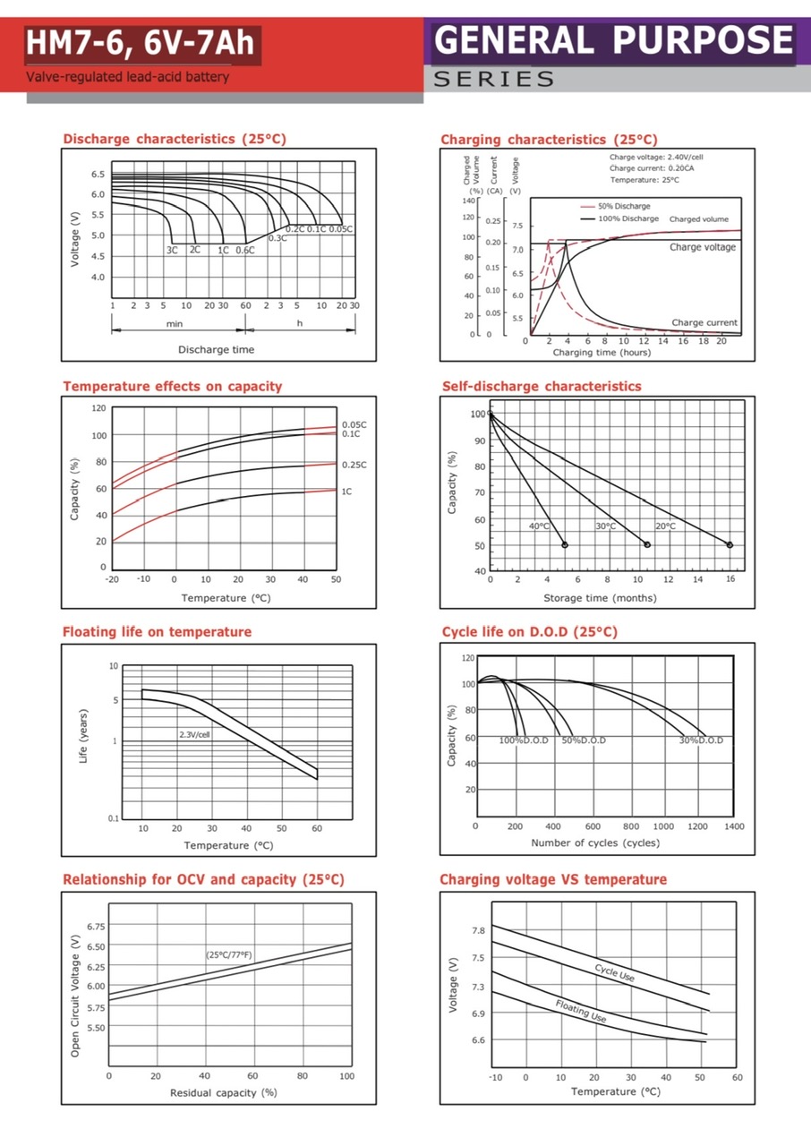 Hình ảnh bảng thông số kỹ thuật Ắc quy 6V 7Ah HAMES HM7-6 / Specifications - Application- Datasheets file PDF Hames Battery HM7-6
