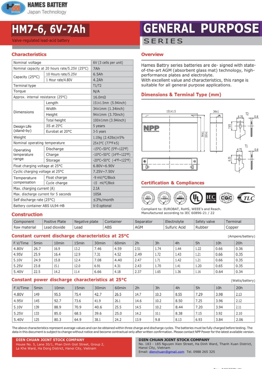 Quý khách cần tư vấn mua hàng Ắc quy 6V 7Ah HAMES HM7-6 xin vui lòng liên hệ: