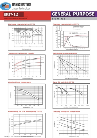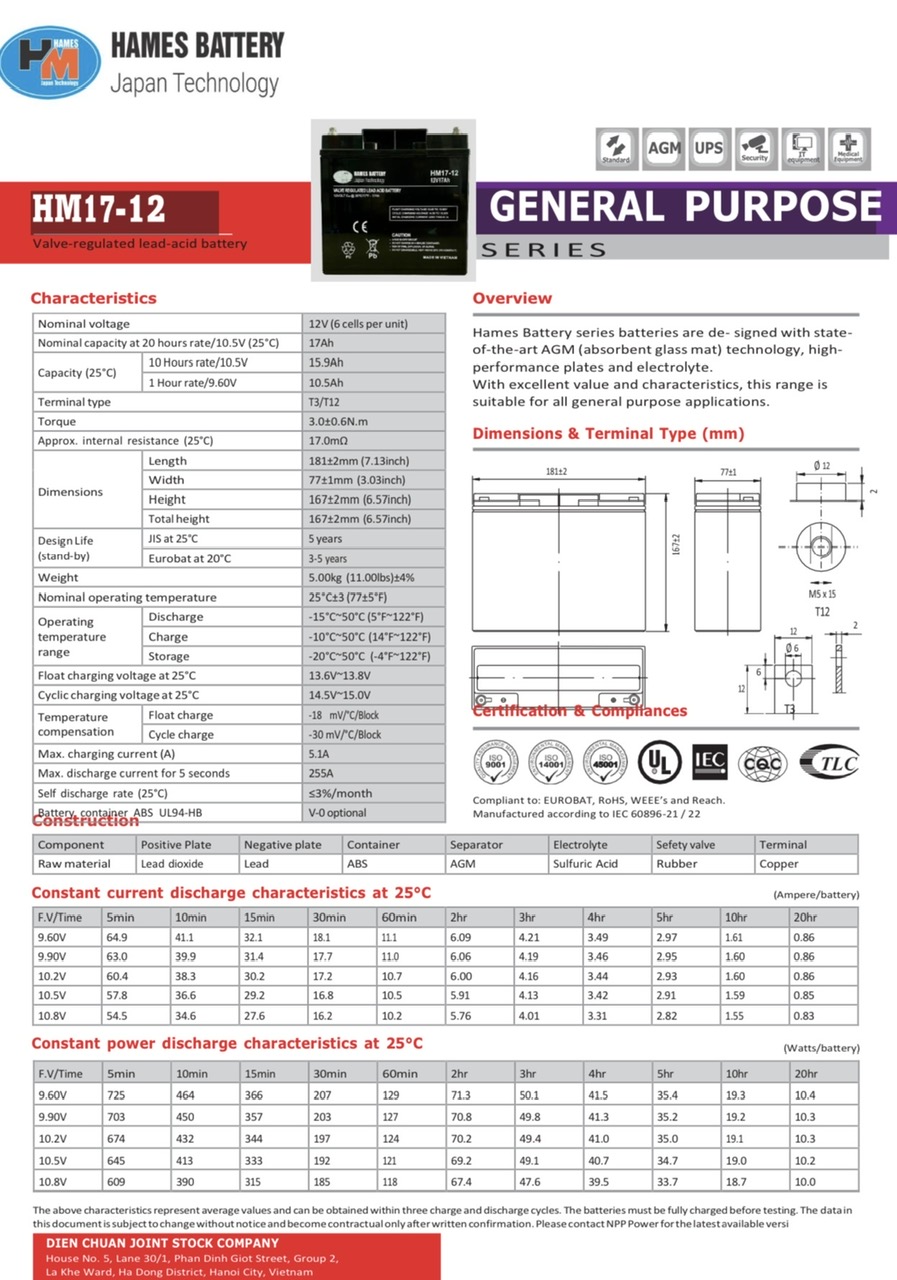 Hình ảnh bảng thông số kỹ thuật Ắc quy Hames 12V-17Ah HM17-12 Specifications - Application- Datasheets file PDF Hames Battery HM17-12