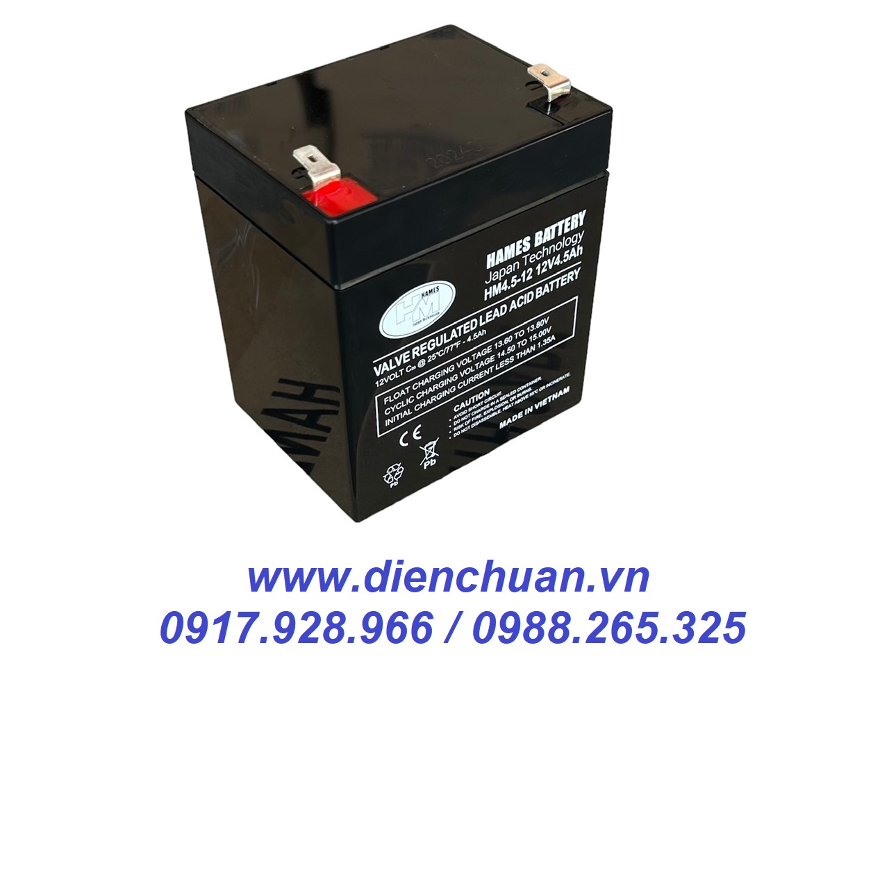 Công ty Điện Chuẩn chuyên cung cấp các sản phẩm ắc quy thương hiệu HAMES chính hãng tại thị trường Việt Nam. Ắc quy HAMES HM4.5-12 (12V 4.5Ah ) được công ty Điện Chuẩn bán tại các tỉnh Hà Nội, Bắc Ninh, Ninh Bình, Nam Định, Ninh Bình, Hải Phòng, Đà Nẵng, Thanh Hoá, Thành phố Hồ Chí Minh và tất cả các tỉnh thành trên cả nước với giá thành hợp lý và chế độ bảo hành chu đáo nhất.