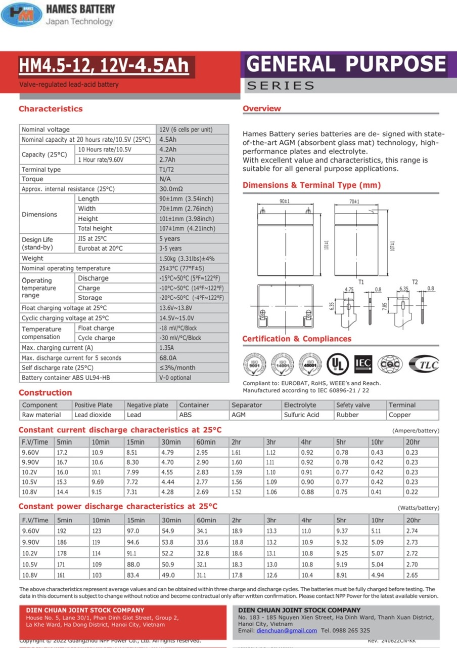 Tại Công ty Điện Chuẩn Điện Chuẩn đang bán bình Ắc quy HAMES HM4.5-12 (12V 4.5Ah ) là : 218,000 VND giá đã bao gồm thuế Vat 10%, quý khách có thể dễ dàng liên hệ với chúng tôi qua số điện thoại / ZALO: 0917.928.966 / 0988.265.325 để có thể nhận được các khuyến mại và mua sản phẩm ắc quy chính hàng với giá rẻ hơn so với các cửa hàng khác trong khu vực.