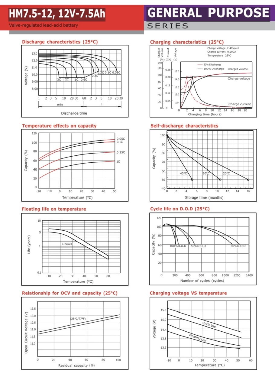 Hình ảnh bảng thông số kỹ thuật Ắc quy Hames HM7.5-12 (12V 7.5Ah) / Specifications - Application- Datasheets file PDF Hames Battery HM7.5-12