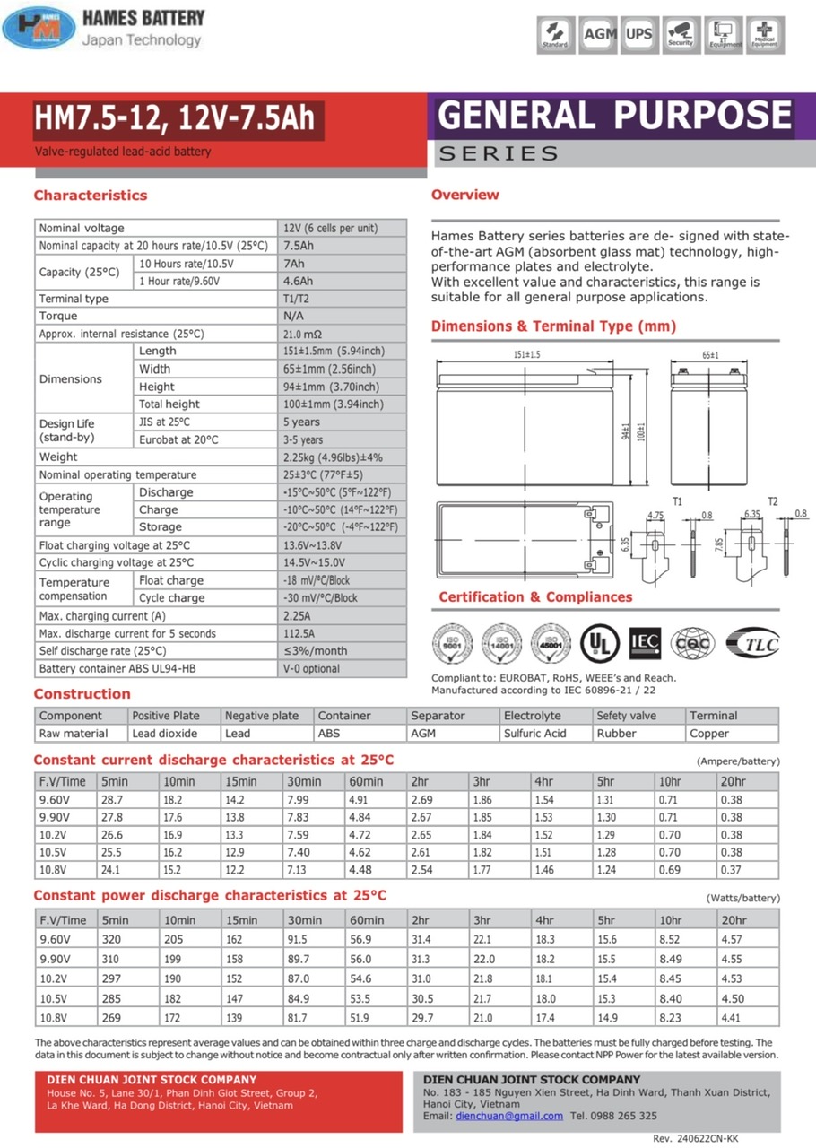 Ắc quy Hames HM7.5-12 (12V 7.5Ah) là loại ắc quy chì – van khô kín khí được thiết kế với công nghệ AGM và được ứng dụng trong các lĩnh vực như UPS, viễn thông, điện công nghiệp... tuân thủ các tiêu chuẩn quốc tế như IEC60896-21/22, BS6290-4, Eurobat Guide.