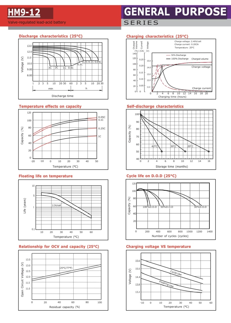 Hình ảnh bảng thông số kỹ thuật Ắc quy Hames 12V-9Ah HM9-12 / Specifications - Application- Datasheets file PDF Hames Battery HM9-12