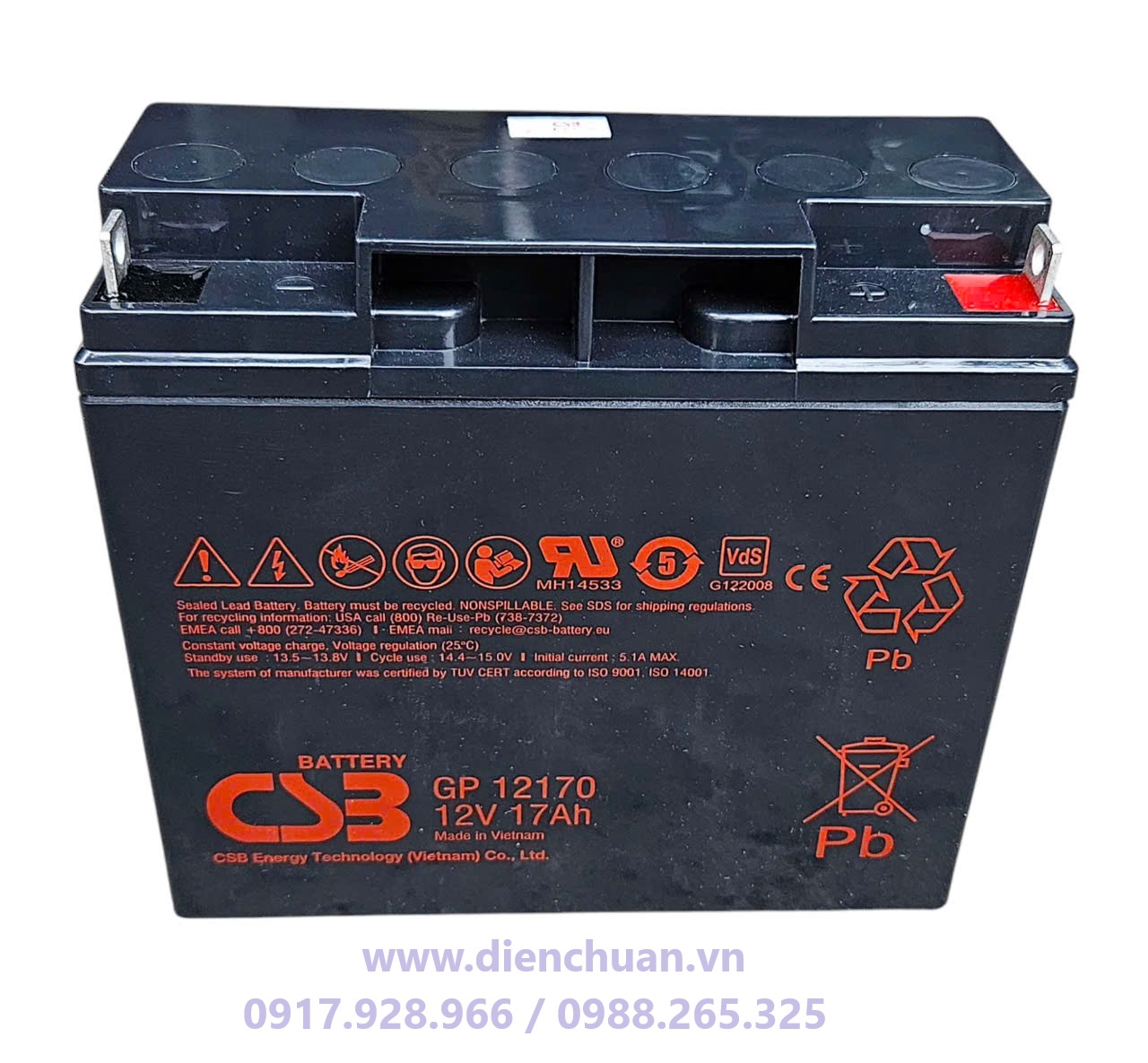 Công ty cổ phần Điện Chuẩn là đơn vị phân phối bình ắc quy CSB GP12170 (12V-17Ah) chính hãng tại thị trường Việt Nam, Điện thoại: 02485854237 – Hotline / ZALO 0917928966 / 0988265325 để được hỗ trợ