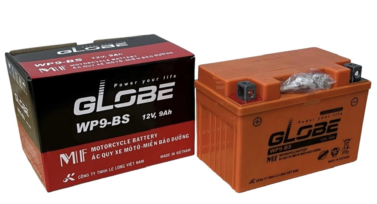 Bình ắc quy xe máy GLOBE WP9-BS (12V-9ah) với dung lượng cao mang lại khả năng vượt trội dùng cho xe gắn máy . Với Công Nghệ Châu Âu Vượt trội đã tạo được chữ Tín và Niềm Tin của Người Tiêu Dùng bằng cách luôn nâng cao Chất Lượng và Cải Tiến Sản Phẩm