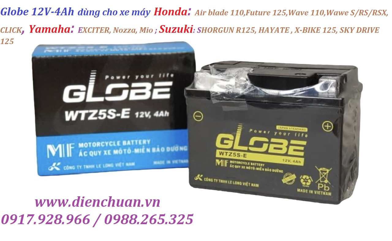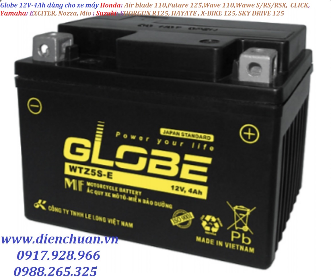 - Ắc quy Globe WTZ5S-E 12V-4Ah là ắc quy Chì thuộc dòng sản phẩm ắc quy miễn bảo dưỡng, khô, kín khí, MF - Maintenanece Free Battery sử dụng lắp đặt xe máy, motor.