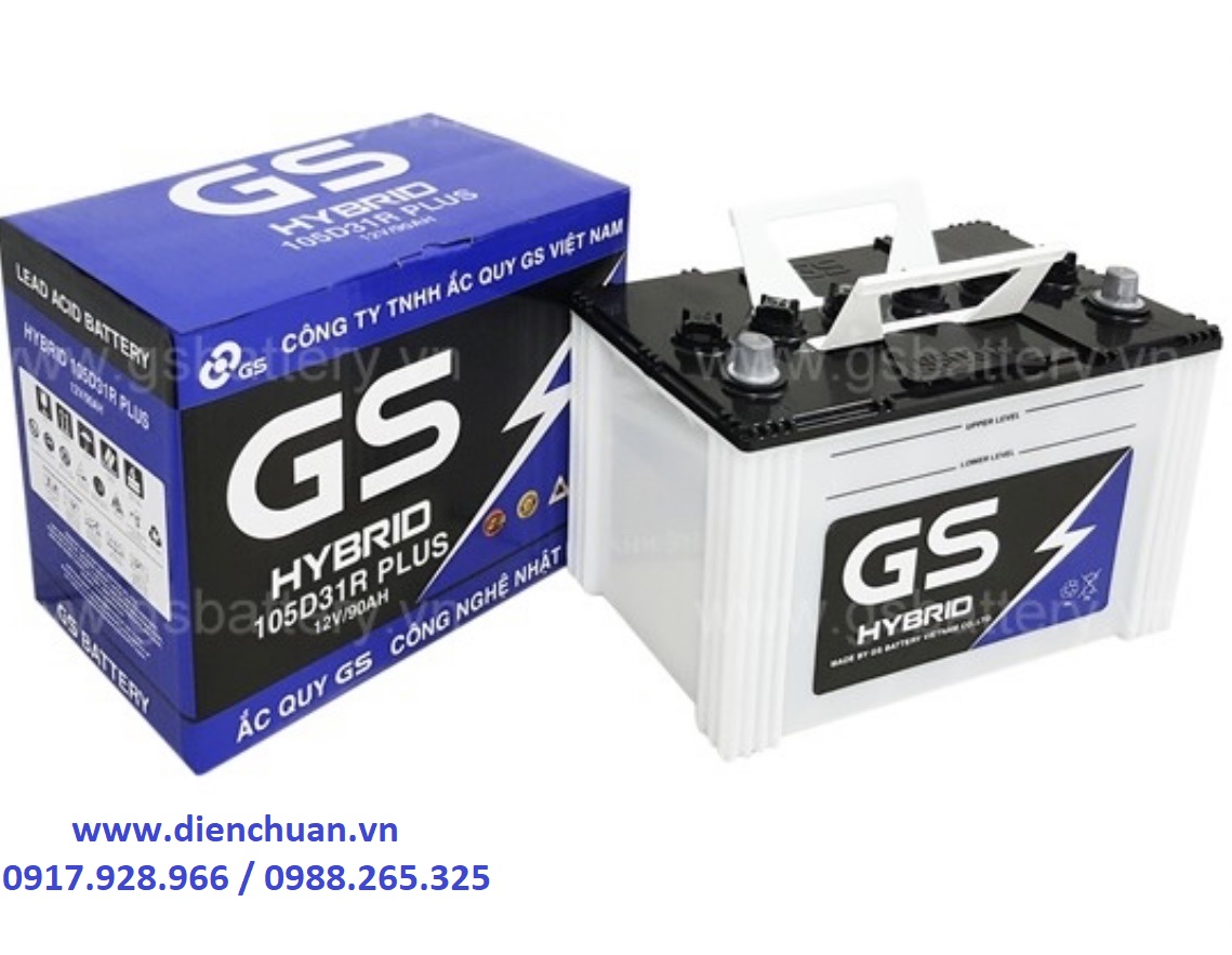 GS HYBRID 105D31R ( 12v - 90AH ) Là ắc quy nước, khi mua đã được nhà bán hàng cho dung dịch axit vào bình. Khách hàng mua về chỉ việc lắp đặt và sử dụng.