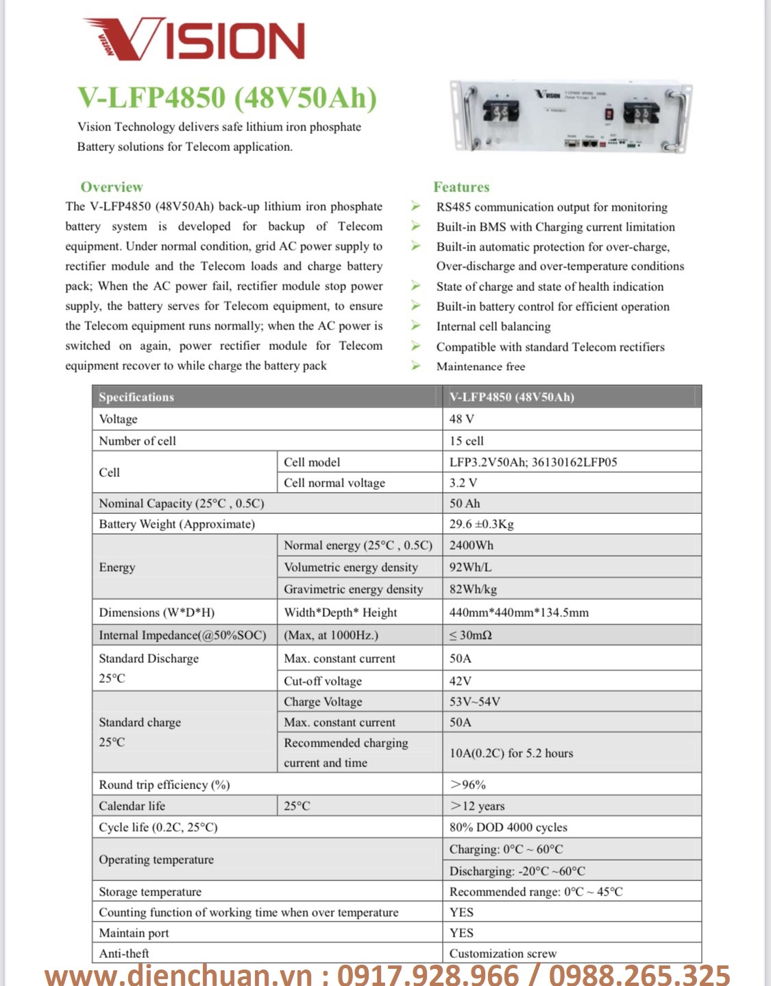 Ắc quy Vision Lithium/Pin lithium-ion 48V 50Ah (V-LFP4850 ) được phát triển để lưu trữ điện dự phòng cho thiết bị Viễn thông. Trong điều kiện bình thường, cung cấp nguồn điện xoay chiều cho mô đun chỉnh lưu và tải, sạc pin viễn thông; Khi mất nguồn AC, mô đun chỉnh lưu sẽ ngừng cấp nguồn, pin phục vụ cho thiết bị Viễn thông, để đảm bảo thiết bị Viễn thông chạy bình thường; khi bật nguồn AC một lần nữa, mô đun chỉnh lưu nguồn cho thiết bị Viễn thông sẽ phục hồi trong khi sạc pin.