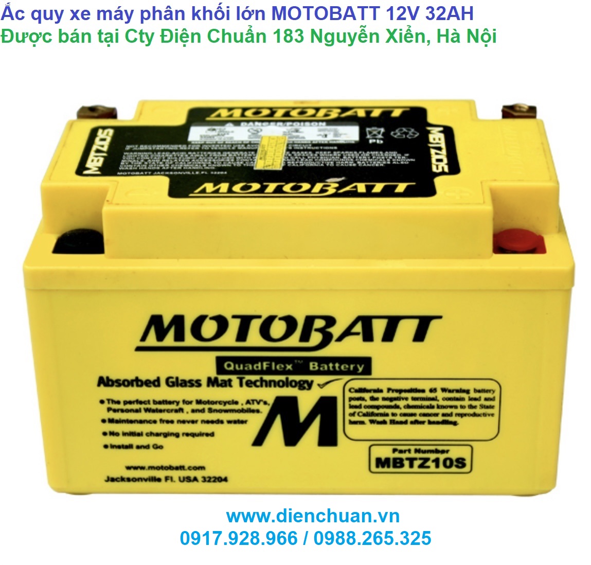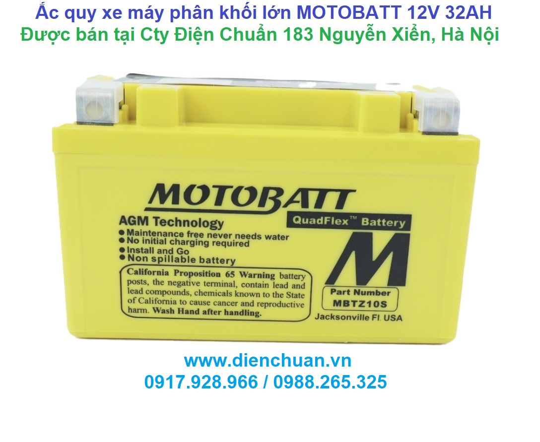Công ty cổ phần Điện Chuẩn chuyên phân phối ắc quy Motobatt chính hãng giá rẻ. Bình Ắc quy xe máy Motobatt MBTZ10S 12V-8.6Ah được công ty Điện Chuẩn bán tại các tỉnh: Hà Nội, Bắc Ninh, Vĩnh Phúc, Ninh Bình, Nam Định, Thái Bình, Hà Nam, Hải Phòng, Đà Nẵng, Thanh Hoá, Bình Dương, Đồng Nai, Thành phố Hồ Chí Minh và tất cả các tỉnh thành trong cả nước