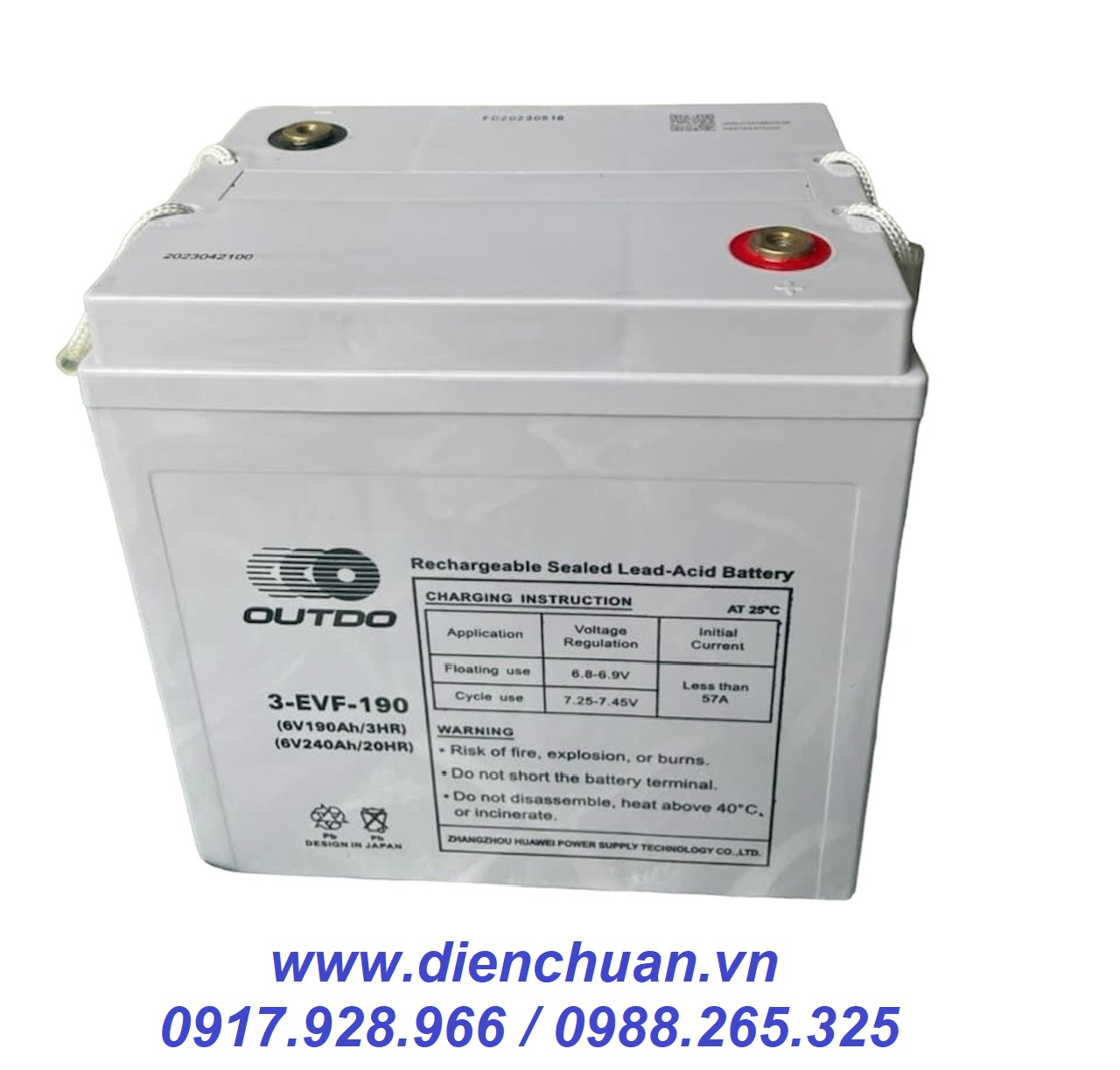 Công ty cổ phần Điện Chuẩn chuyên phân phối ắc quy OUTDO chính hãng giá rẻ. Bình Ắc quy 6V-190Ah Outdo 3-EVF-190 được công ty Điện Chuẩn bán tại các tỉnh: Hà Nội, Bắc Ninh, Vĩnh Phúc, Ninh Bình, Nam Định, Thái Bình, Hà Nam, Hải Phòng, Đà Nẵng, Thanh Hoá, Bình Dương, Đồng Nai, Thành phố Hồ Chí Minh và tất cả các tỉnh thành trong cả nước .