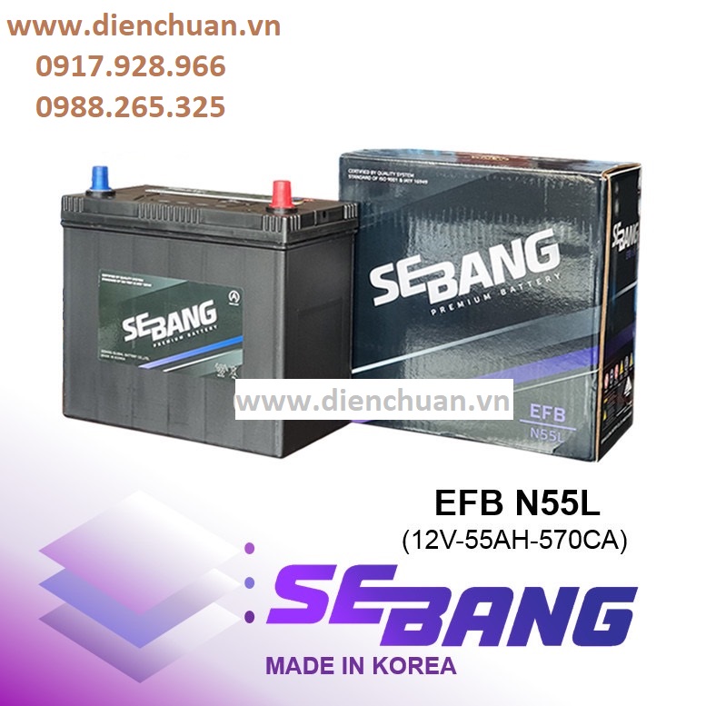 Ắc quy Sebang gồm 3 loại chính: SMF, EFB và AGM. Bình Sebang 55AH thuộc loại EFB có chỉ số dòng khởi động cao hơn các bình ắc quy thông thường, công suất và độ bền bỉ cao.