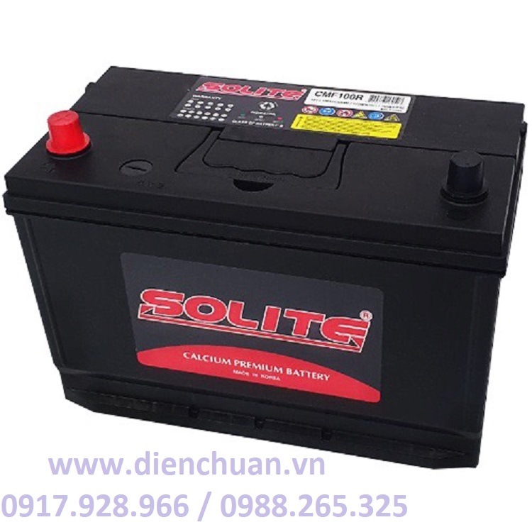 - Bình ắc quy Solite CMF100R (12V-100AH) mang dòng khởi động là 750 (CCA). Là loại ắc quy miễn bảo dưỡng (Maintenance Free - MF) Thiết kế đạt chuẩn công nghệ MF bên trong cho phép ắc quy giảm thiểu tối đa chất điện phân, ắc quy được sử dụng tấm cách siêu Polymer có bộ phân tách điện trở thấp.