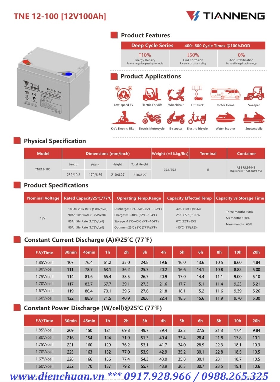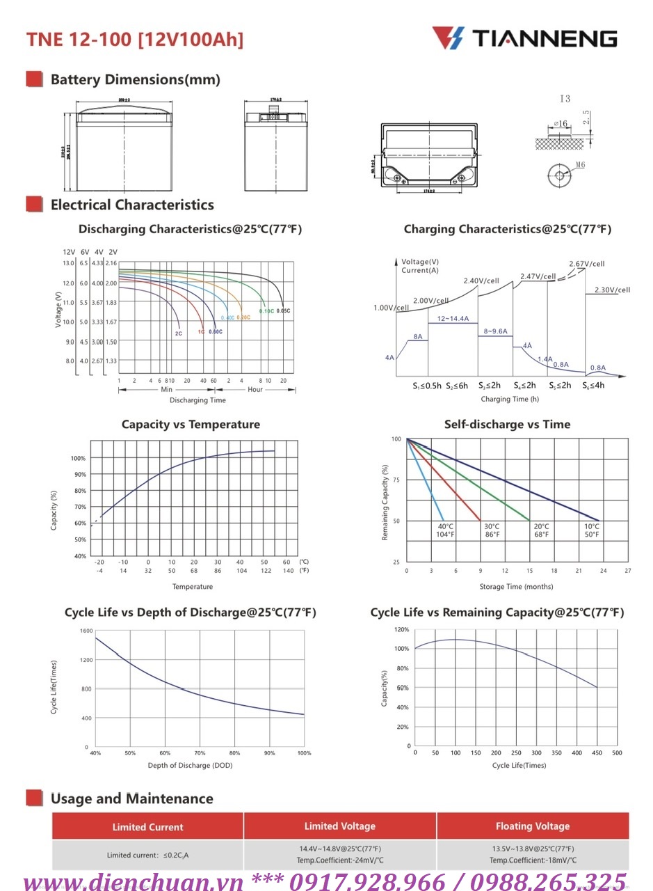 Thông số kỹ thuật ắc quy Tianneng TNE12-100: