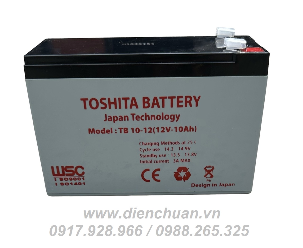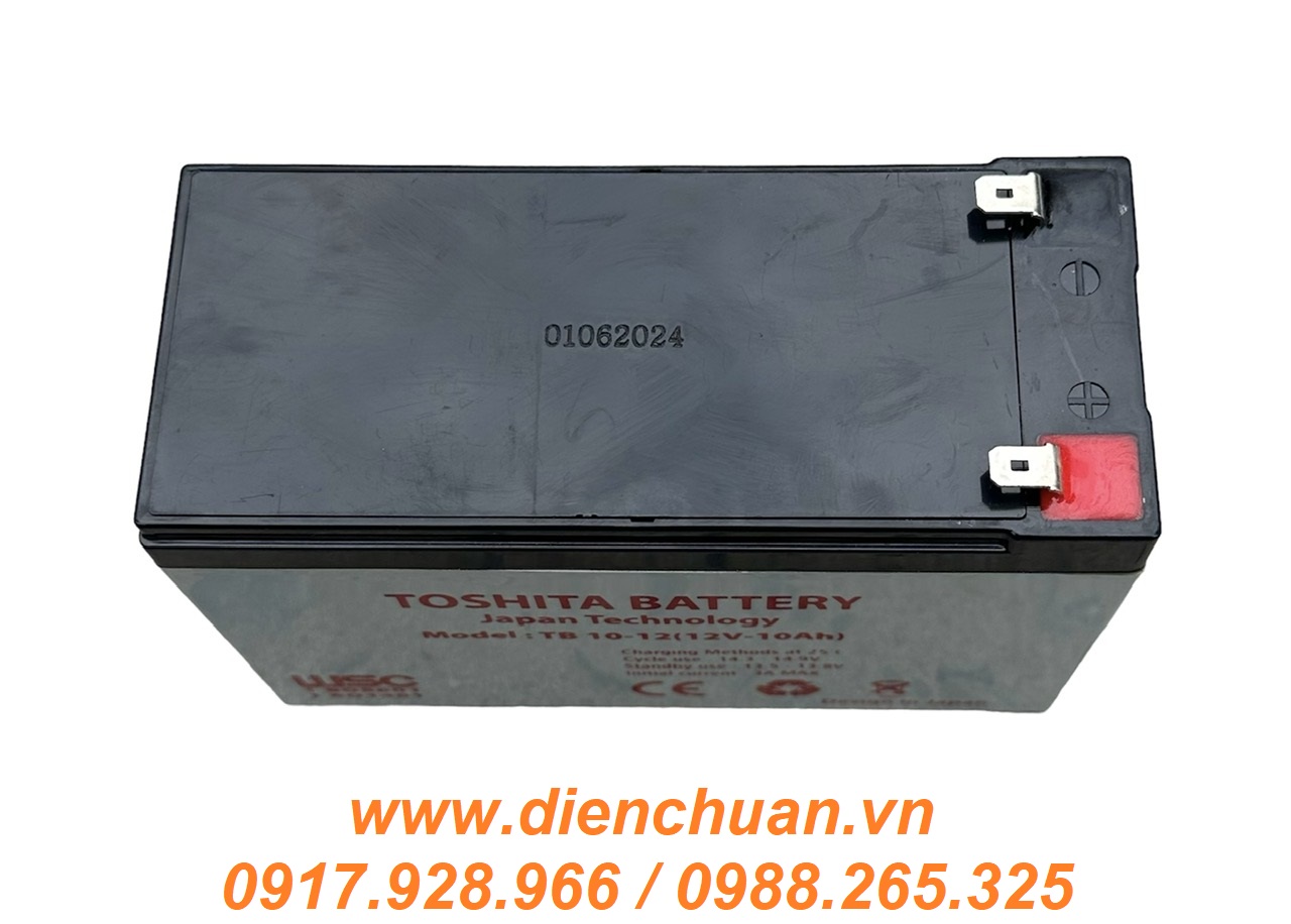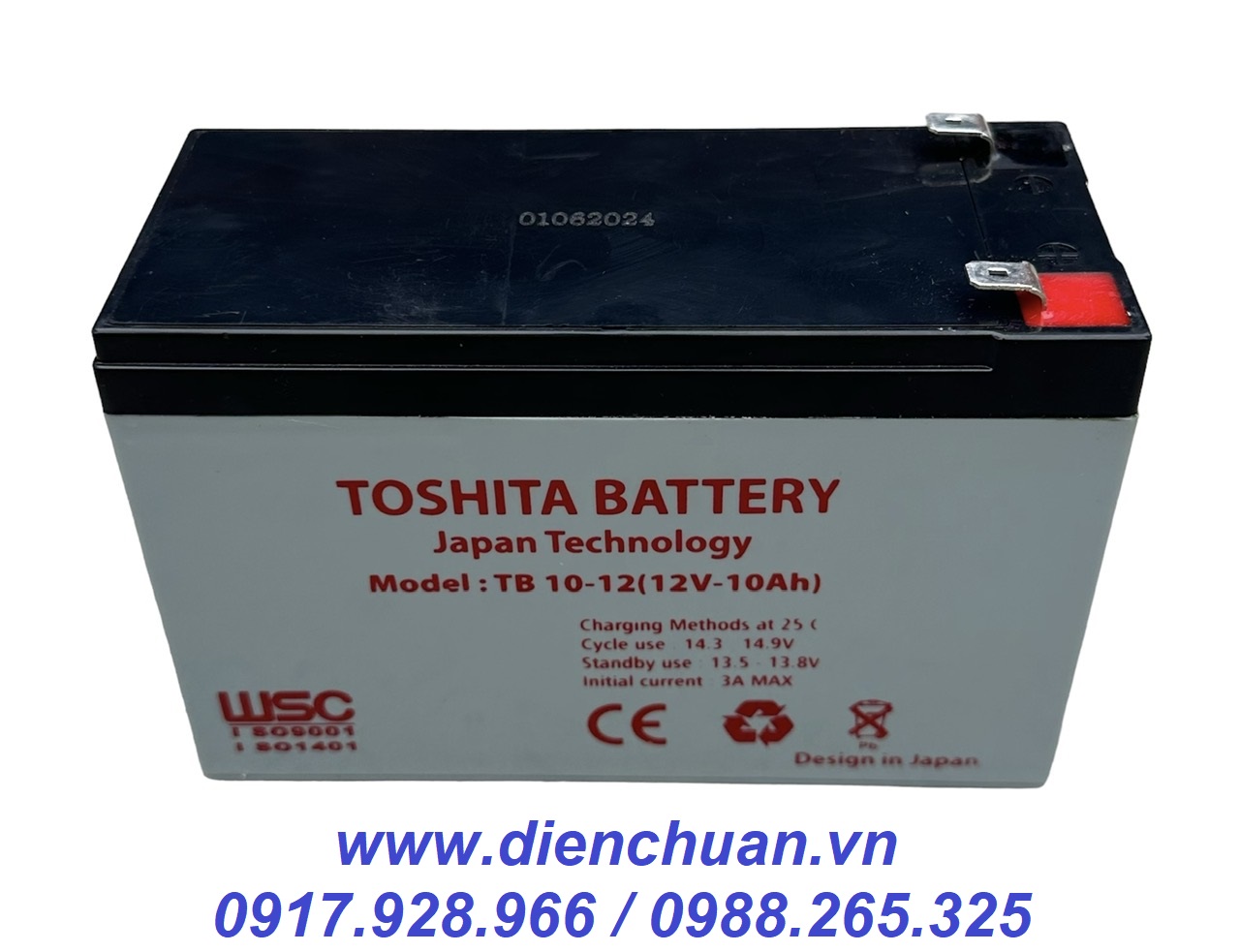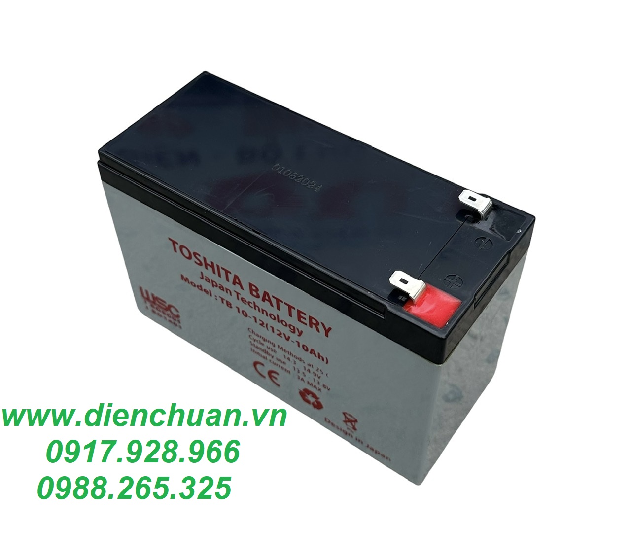 Công ty Điện Chuẩn cung cấp các sản phẩm ắc quy thương hiệu TOSHITA chính hãng giá rẻ . Ắc quy TOSHITA 12V-10Ah TB10-12 dùng cho UPS, thiết bị viễn thông, thiết bị mạng, cứu hộ thang máy, xe điện trẻ em , loa kéo, bình thuốc trừ sâu ... vv ... được công ty Điện Chuẩn bán tại các tỉnh Hà Nội , Bắc Ninh , Ninh Bình , Nam Định, Ninh Bình,Hải Phòng , Đà Nẵng , Thanh Hoá và Thành phố Hồ Chí Minh và tất cả các tỉnh thành trên cả nước với giá thành hợp lý phải chăng và chế độ bảo hành chu đáo nhất