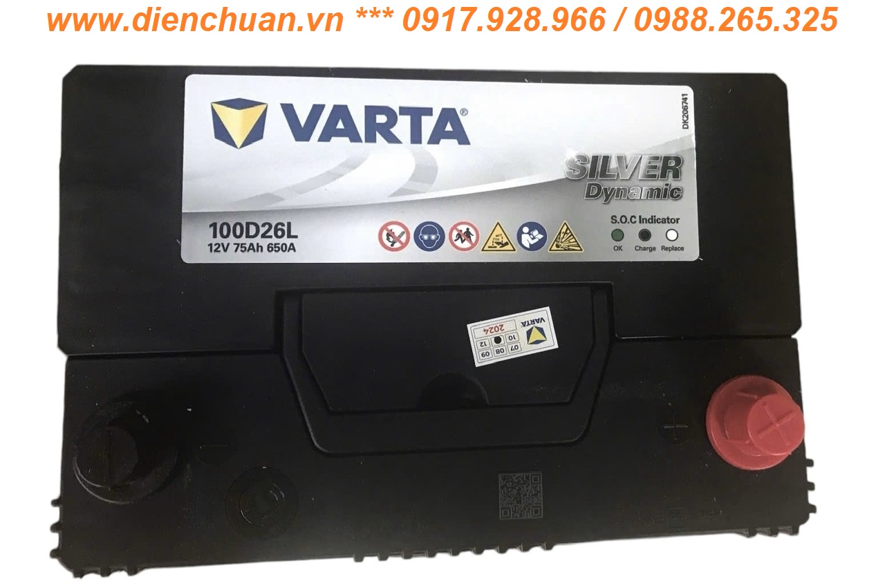Ắc quy Varta 12V 75Ah 100D26R/L, CCA 650, chuẩn cọc to, kích thước (mm): 260 x 172 x 225,