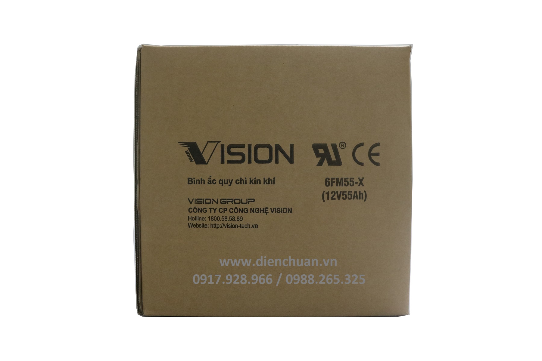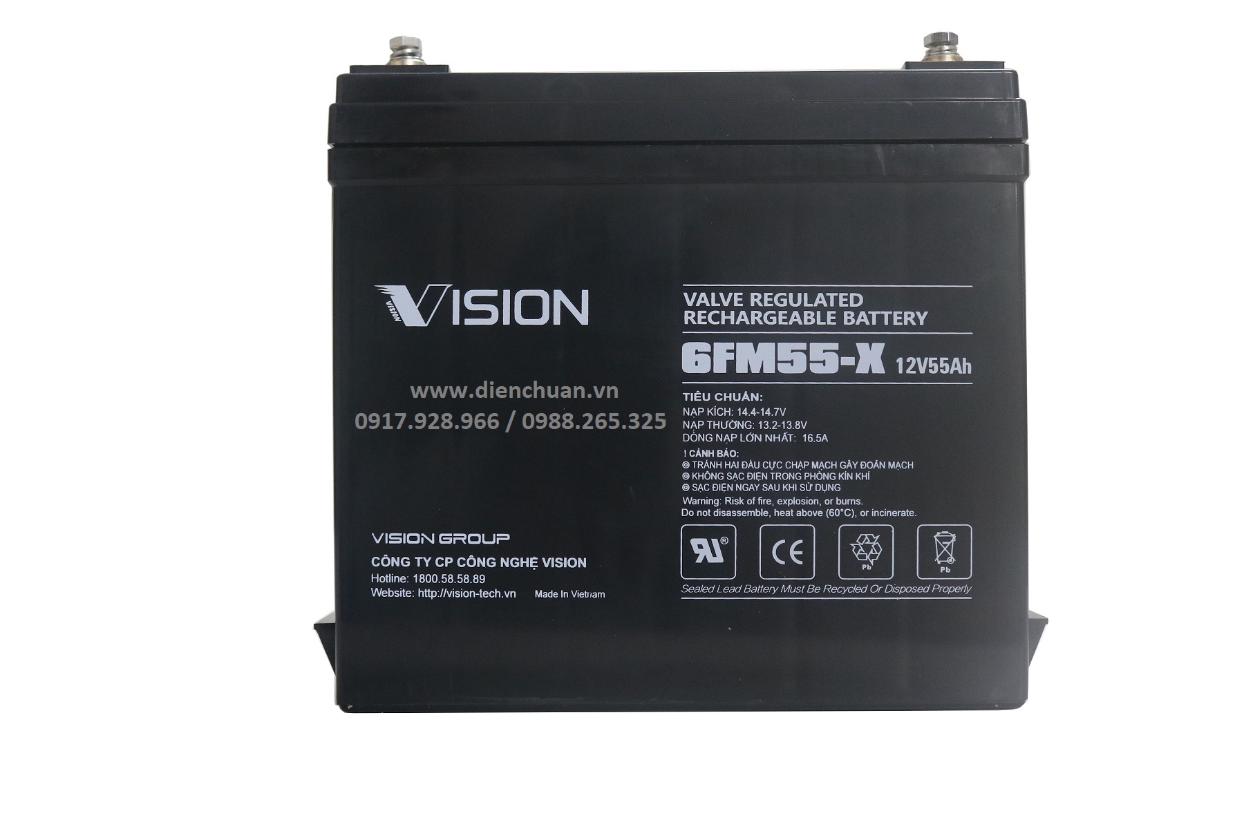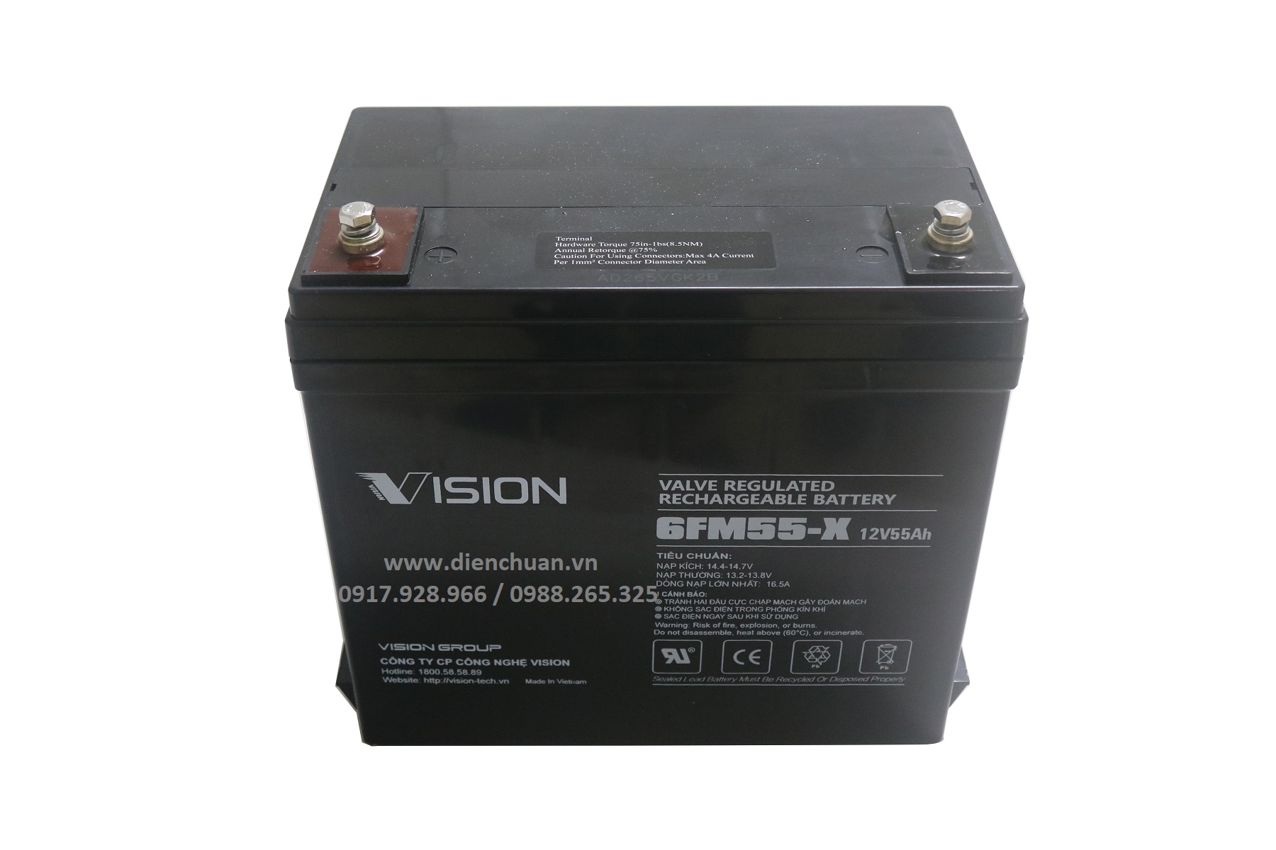 Ắc quy Vision 12V 55Ah 6FM55-X là ắc quy dùng dự phòng dùng cho UPS, Inverter, Solar, Telecom, công nhiệp, thiết bị viễn thông, thiết bị mạng ... vv ...