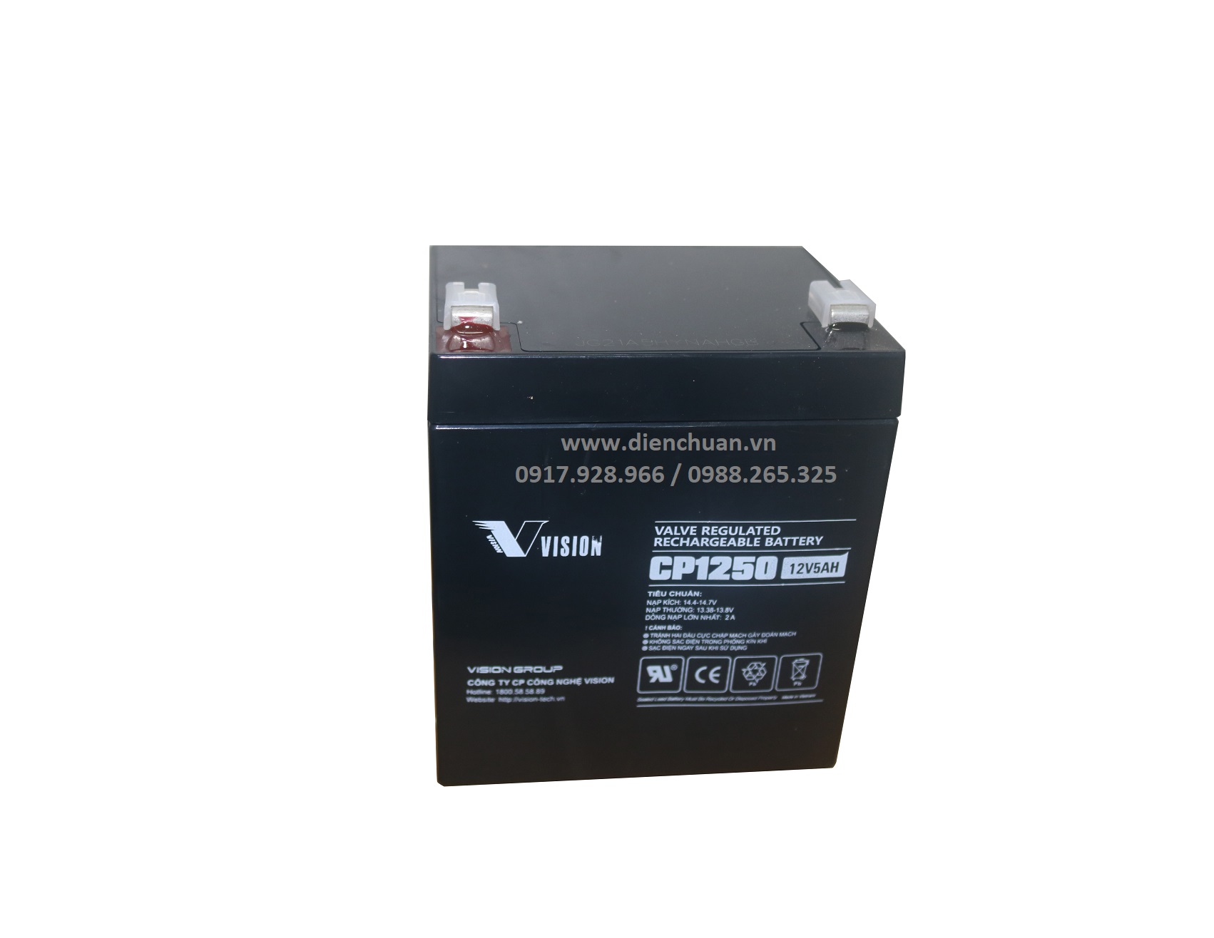 - Ắc quy Vision CP1250( 12V 5Ah) chuyên dùng cho UPS. Tuổi thọ hàng chục năm, thời gian phóng điện gấp 1,6 lần ắc quy khởi động (ắc quy dùng để khởi động ô tô) cùng dung lượng.