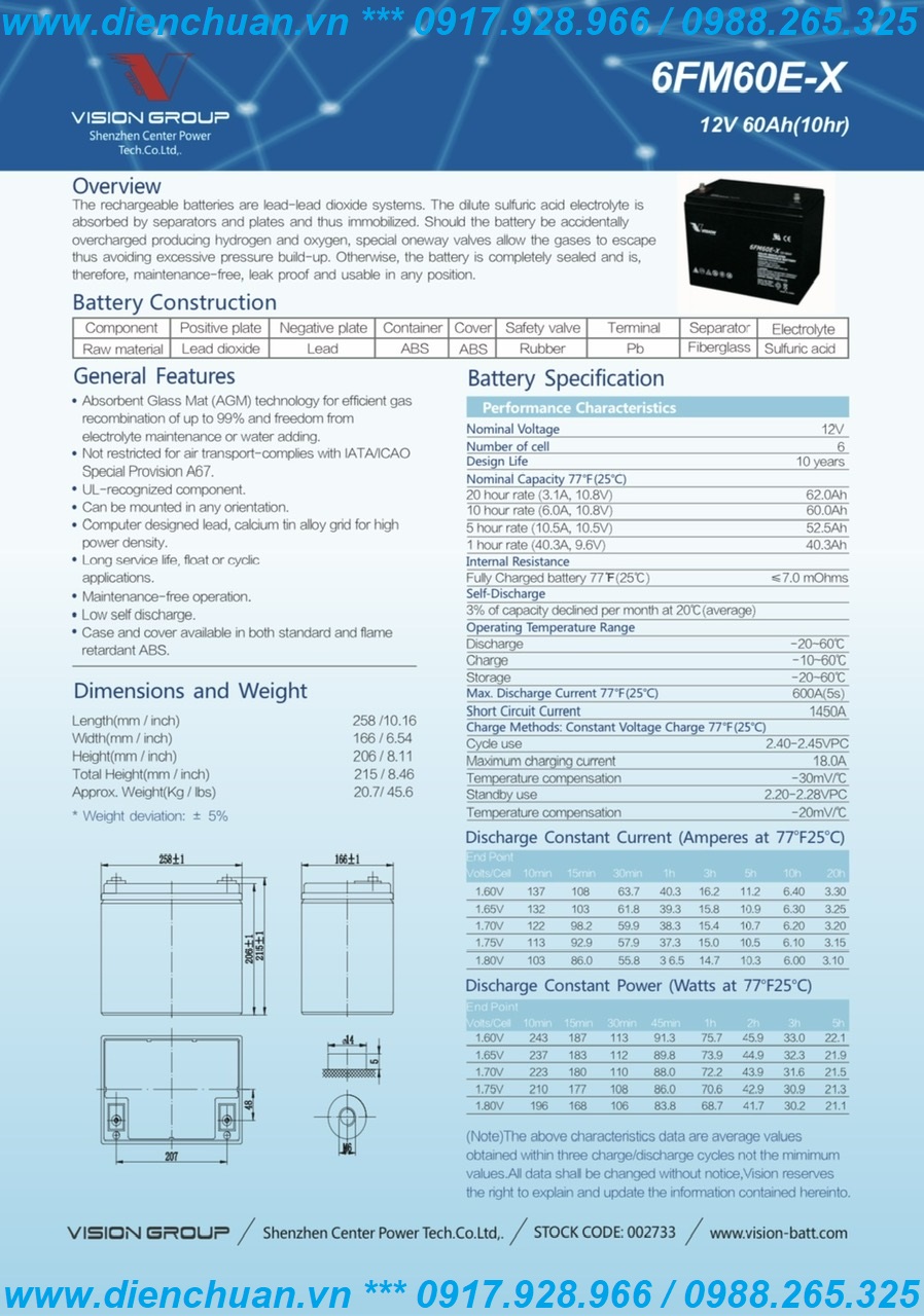 Công ty Điện Chuẩn được khách hàng đánh giá cao về chất lượng hàng hóa cũng như dịch vụ sau bán hàng, chúng tôi chuyên phân phối tất cả các tấm pin năng lượng mặt trời, các loại kích điện/ inverter sin chuẩn, bộ hoà lưới điện bình ắc quy các loại, trong đó có Bình Ắc quy Vision 6FM60-X/ 6FM60E-X (12V 60Ah), Điện Chuẩn có dịch vụ giao hàng lắp đặt tận nơi cho quý khách. Ngoài ra công ty Điện Chuẩn chúng tôi còn hỗ trợ vận chuyển hàng ra gửi các bến xe về tất cả các tỉnh thành trên toàn quốc cho khách hàng, cũng như gửi chuyển phát COD qua bưu điện, Viettel, giao hàng nhanh, giao hàng tiết kiệm, J&T ... vv..., nhận được hàng quý khách mới phải thanh toán.
