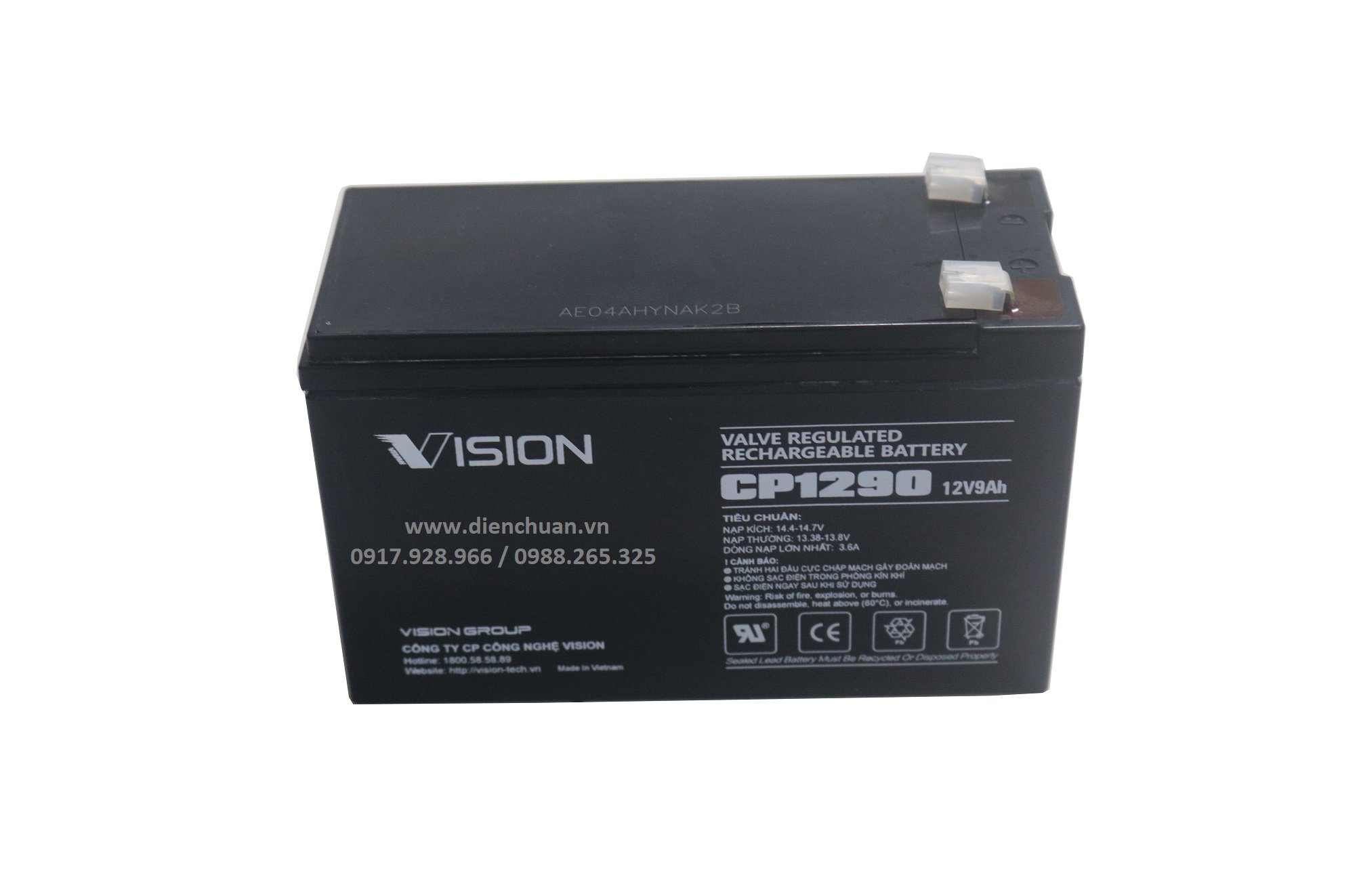 Ắc quy Vision 12V 9Ah ( CP1290 ) chính hãng, giá tốt, sản xuất tại Việt Nam được công ty cổ phần Điện Chuẩn phân phối tại: Hà Nội, Tp HCM, Đà Nẵng, Hải Phòng, Bắc Ninh, Vĩnh Phúc.... dùng cho lưu điện UPS, kích điện, Solar năng lượng mặt trời, thiết bị viễn thông, thiết bị mạng ... vv ...