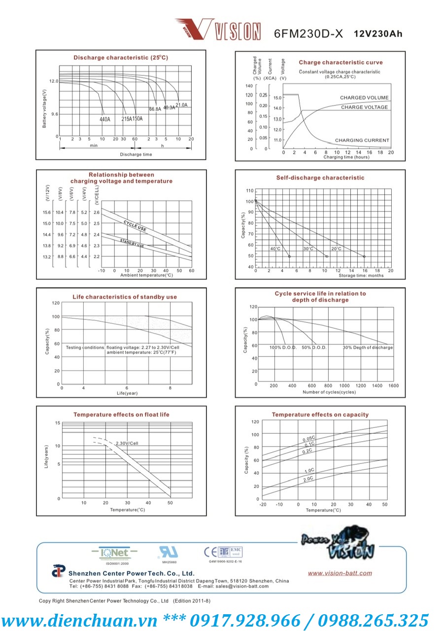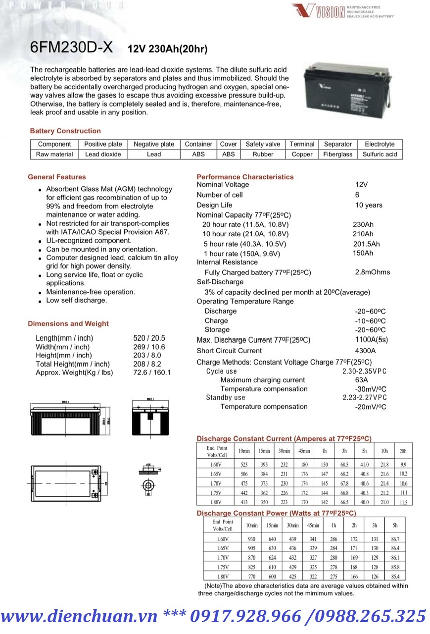 Đặc tính chung của Ắc quy viễn thông Vision 6FM230D-X (12V-230Ah)