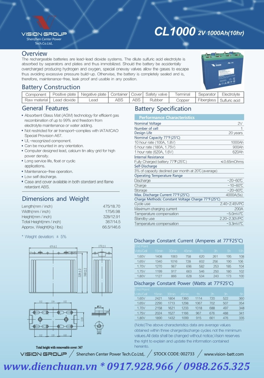 Công ty Điện Chuẩn chuyên cung cấp các sản phẩm ắc quy thương hiệu Vision chính hãng giá rẻ . Ắc quy Vision CL1000 ( 2V 1000Ah ) được công ty Điện Chuẩn bán tại các tỉnh Hà Nội , Bắc Ninh , Ninh Bình , Nam Định, Ninh Bình,Hải Phòng , Đà Nẵng , Thanh Hoá và Thành phố Hồ Chí Minh và tất cả các tỉnh thành trên cả nước với giá thành hợp lý phải chăng và chế độ bảo hành chu đáo nhất.