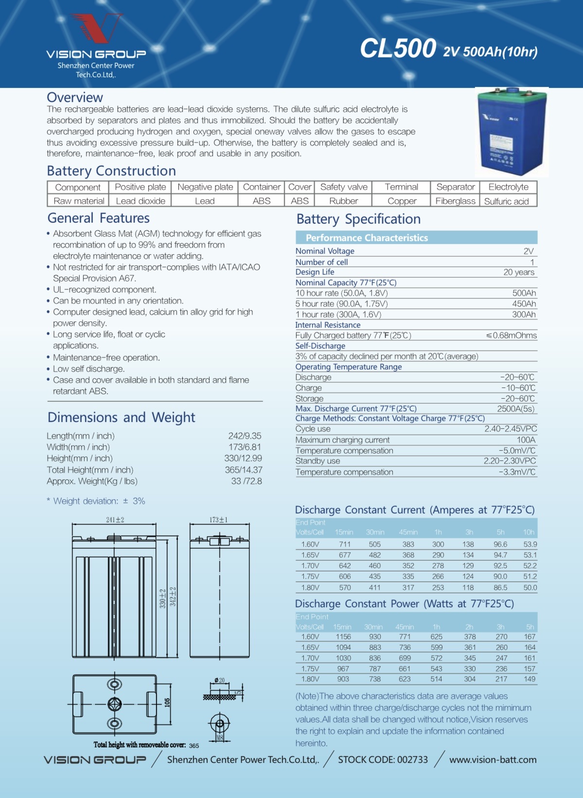 Hình ảnh bảng mô tả thông số kỹ thuật ắc quy Vision CL500 ( 2V 500Ah ) - ( Technical Specification/ Catalog PDF Vision CL500 ( 2V 500Ah )