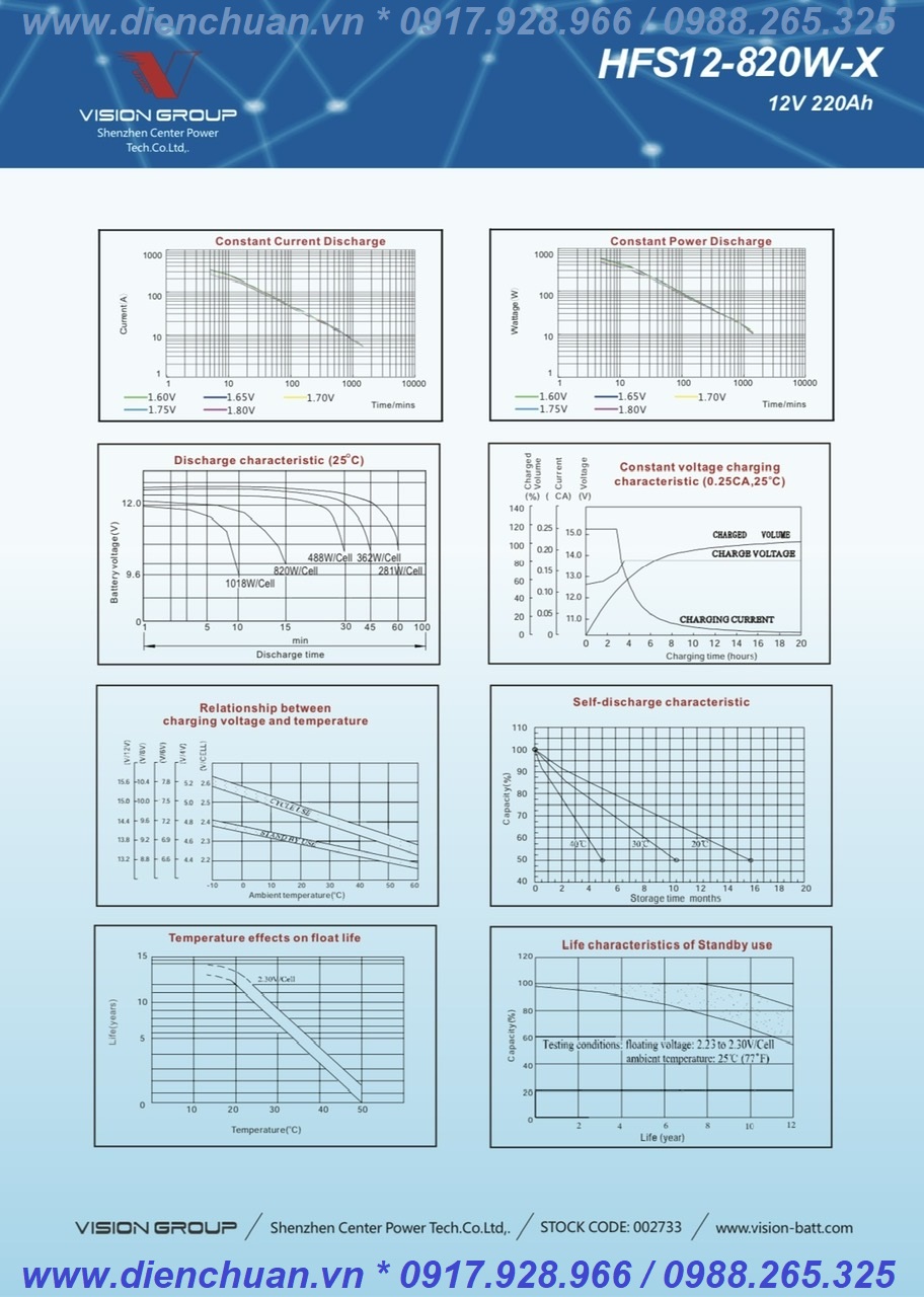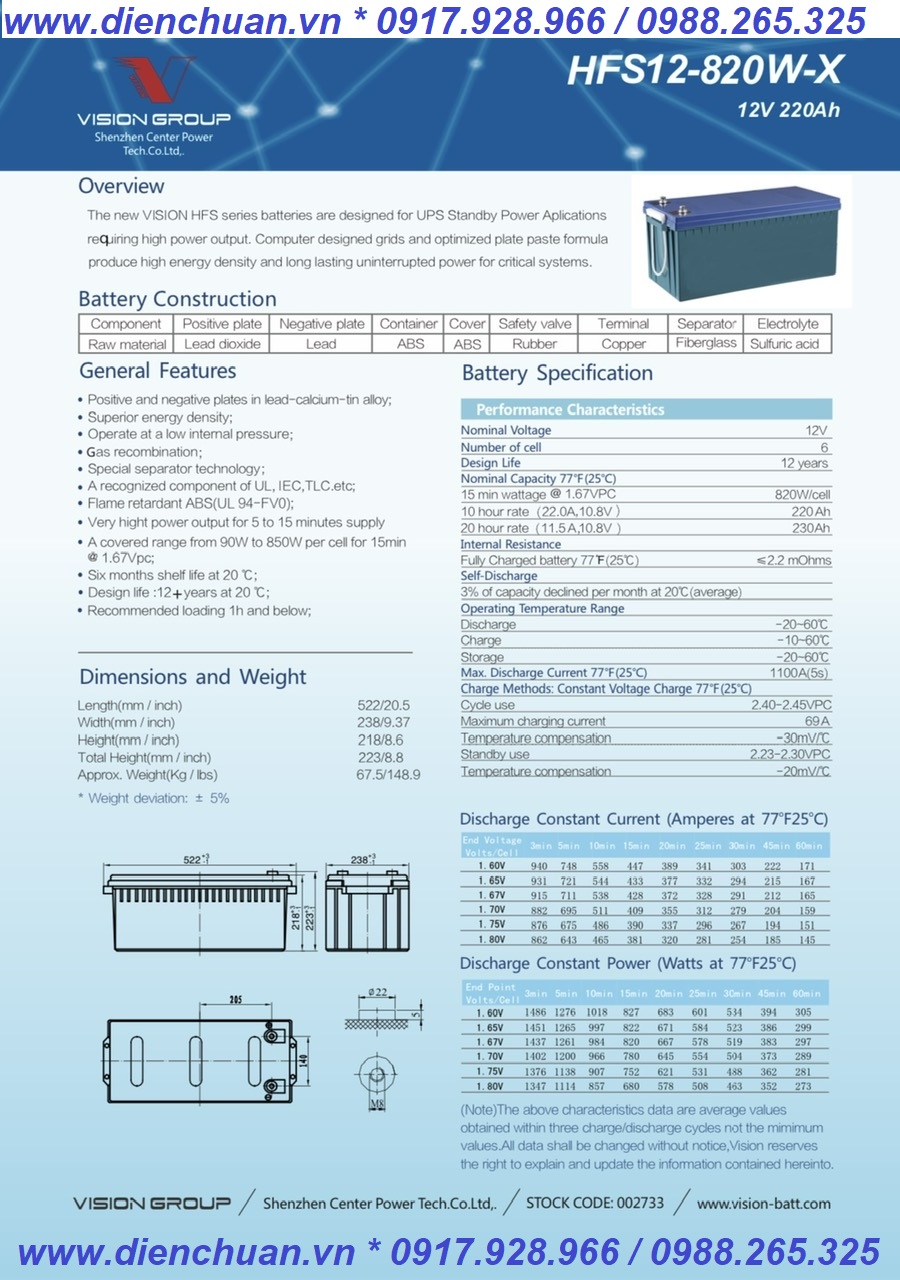 Thông tin về ắc quy viễn thông Vision HFS12-820W-X (12V 220Ah )