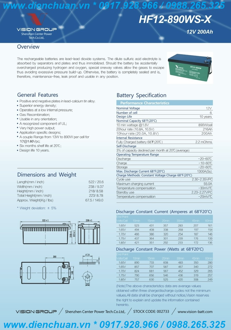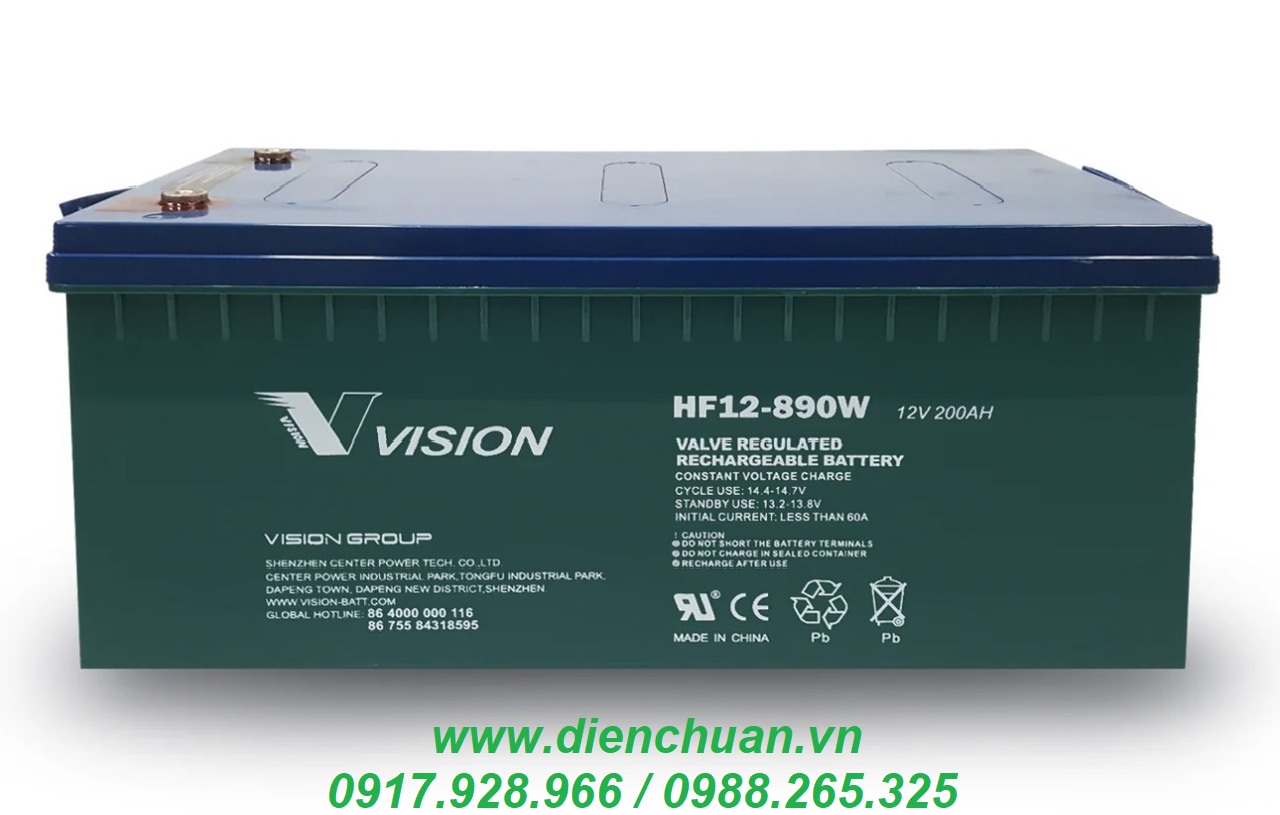 - Ắc quy viễn thông Vision HFS12-890W (12V 200Ah ) công nghệ AGM được người tiêu dùng đánh giá là một trong những sản phẩm có chất lượng, tuổi thọ tốt nhất khi nhắc đến ngày công nghiệp ắc quy viễn thông hiện nay. Vỏ bình được làm bằng chất liệu nhựa ABS hoặc HBO có khả năng chống cháy tốt, cho độ bền cao.