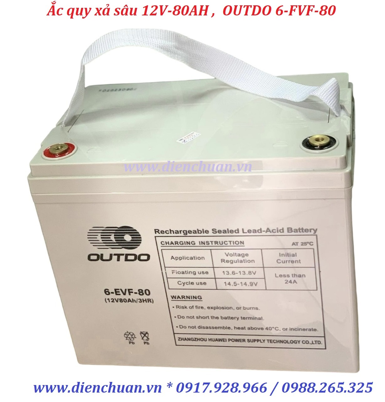 Công ty cổ phần Điện Chuẩn chuyên phân phối ắc quy OUTDO chính hãng giá rẻ. Bình Ắc quy 12V-80Ah Outdo 6-EVF-80 được công ty Điện Chuẩn bán giá rẻ tại các tỉnh: Hà Nội, Bắc Ninh, Vĩnh Phúc, Ninh Bình, Nam Định, Thái Bình, Hà Nam, Hải Phòng, Đà Nẵng, Thanh Hoá, Bình Dương, Đồng Nai, Thành phố Hồ Chí Minh và tất cả các tỉnh thành trong cả nước .