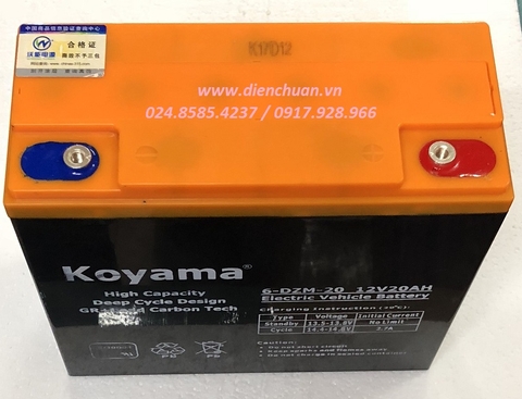 Ắc quy khô Koyama 6-DZM-20 là loại ắc quy kín khí, không cần bảo dưỡng là một trong những loại ắc quy lắp cho xe đạp điện tốt nhất trên thị trường hiện nay.