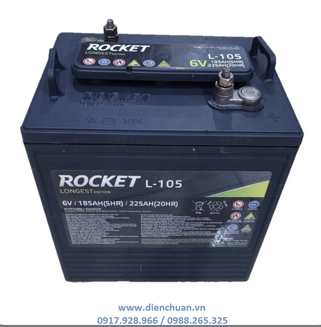 Ắc quy Rocket L-105 6V-225AH chính hãng, giá tốt, nhập khẩu Hàn quốc được công ty cổ phần Điện Chuẩn phân phối tại: Hà Nội, Tp HCM, Đà Nẵng, Hải Phòng, Bắc Ninh, Vĩnh Phúc.. dùng cho xe nâng người, xe điện, máy chà sàn: Xe nâng người Haullote, Xe nâng người Genie, xe nâng người Skyjack, xe nâng người JLG, máy chà sàn Karcher, Máy chà sàn Tennant, xe golf club car, xe điện EZ-go, xe điện Mashell, xe điện Eagle..