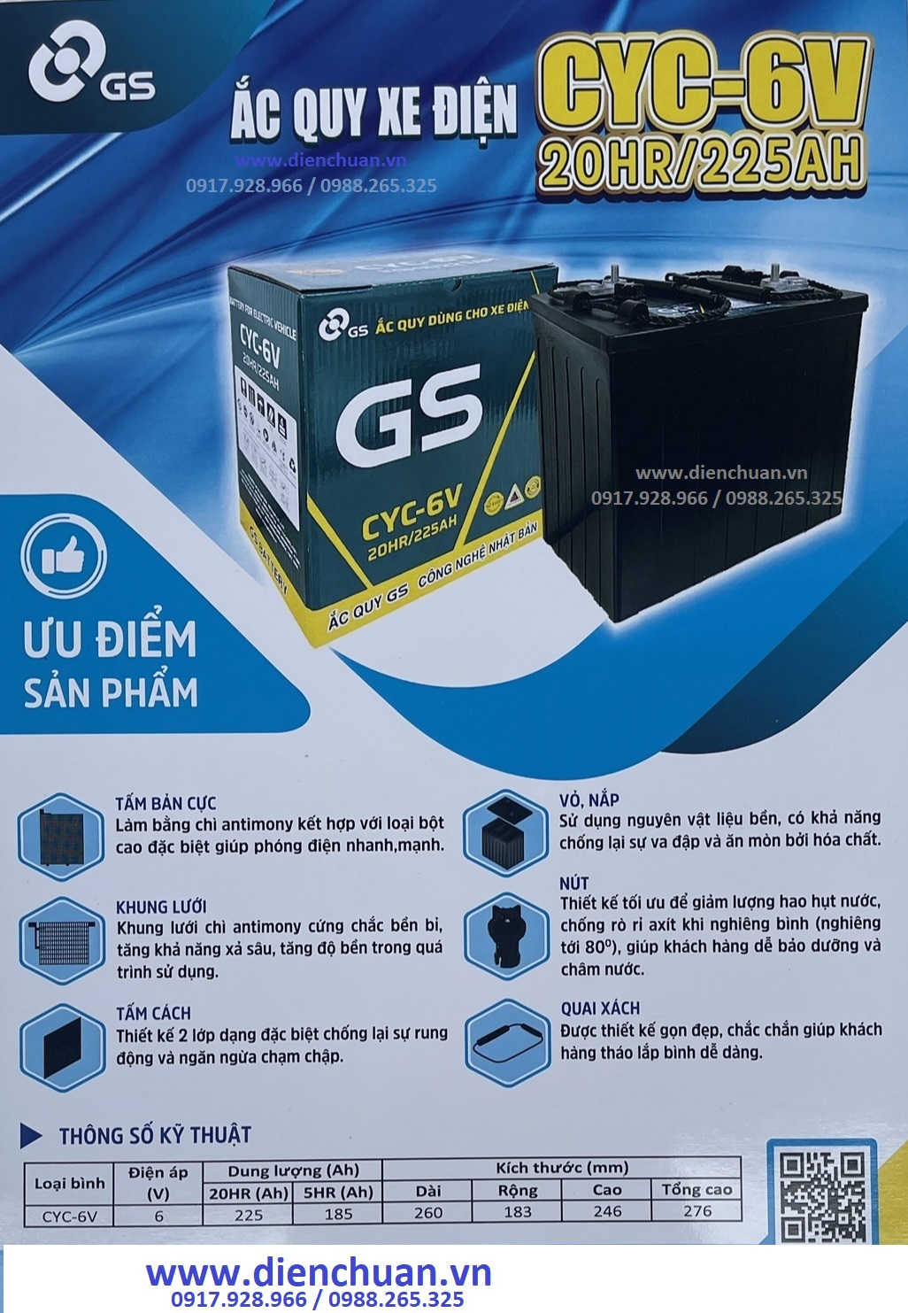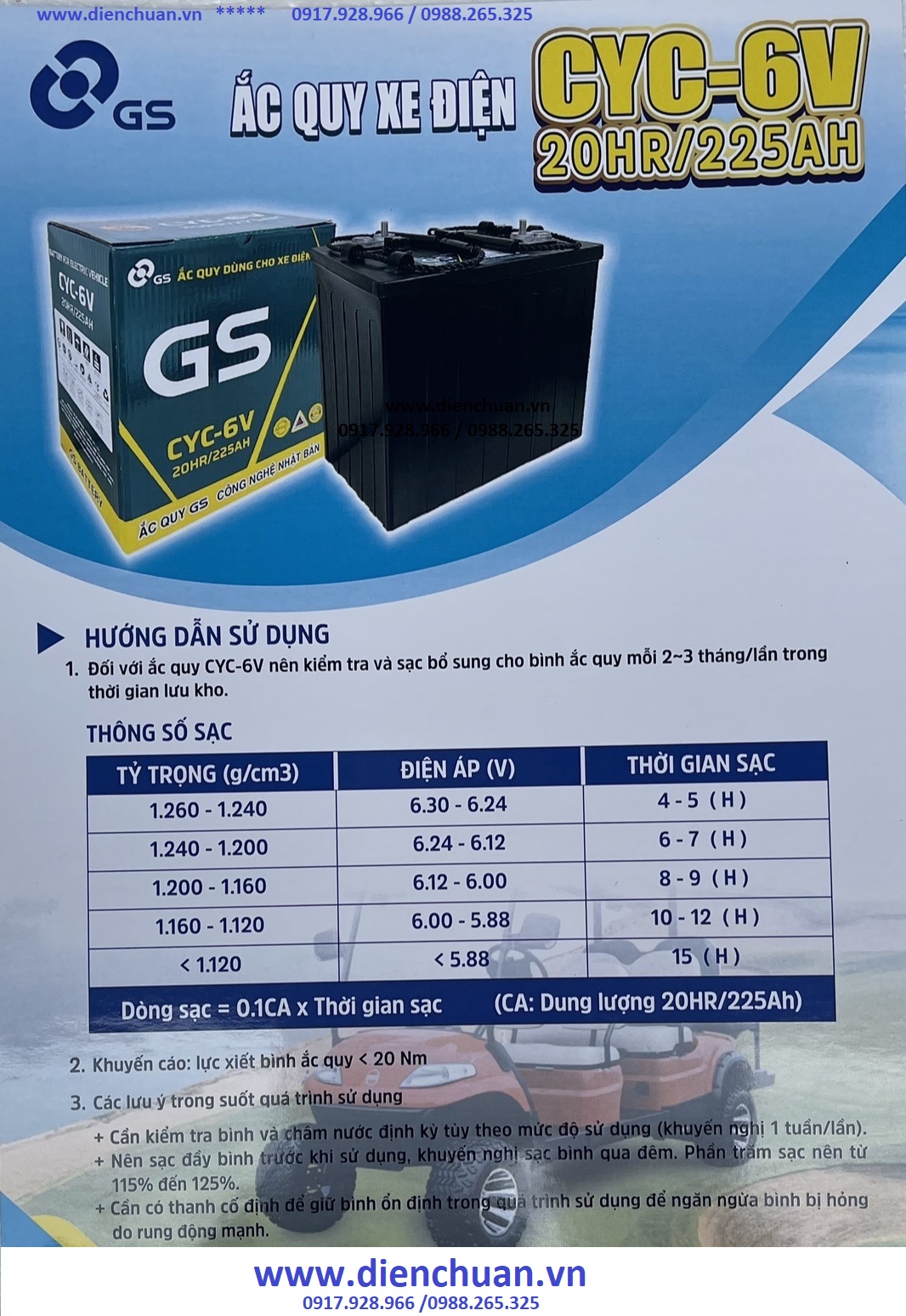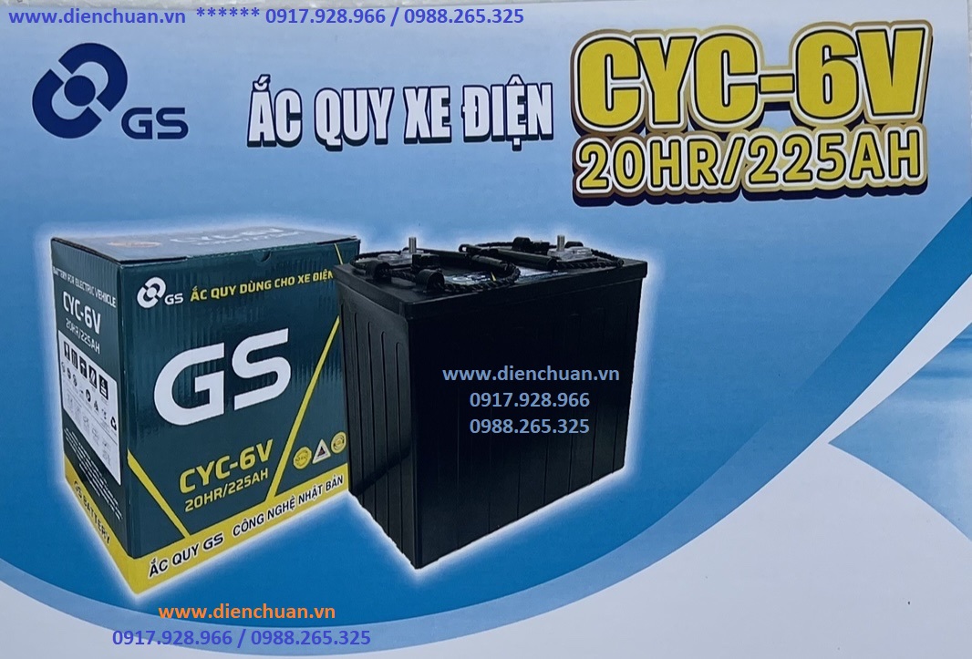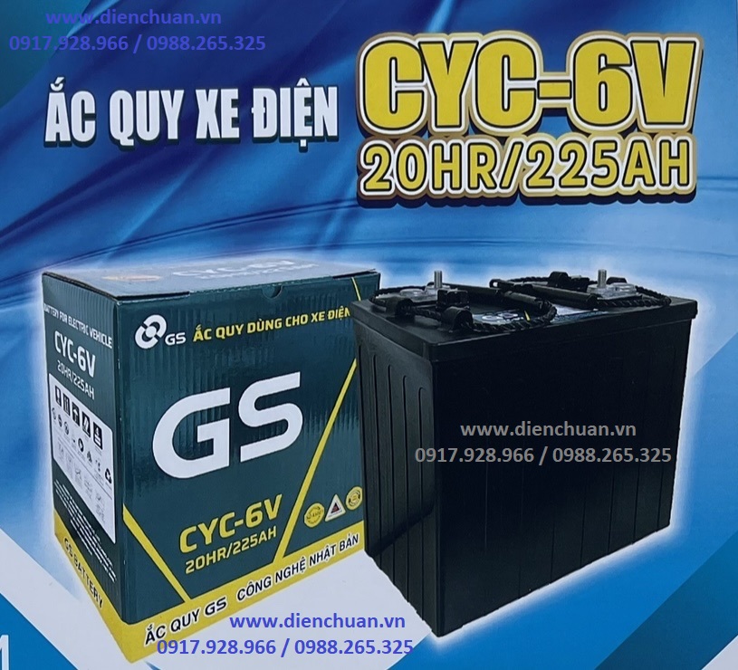 Ắc quy GS CYC-6V 20HR/225AH : là loại ắc quy chì acid có khả năng phóng sâu để duy trì hoạt động cho các loại xe điện, xe gôn, xe nâng điện .... trong thời gian dài. Đây là loại ắc quy đang được phân phối rộng rãi tại thị trường Việt Nam và được khách hàng đánh giá là một trong những loại ắc quy tốt nhất hiện nay.