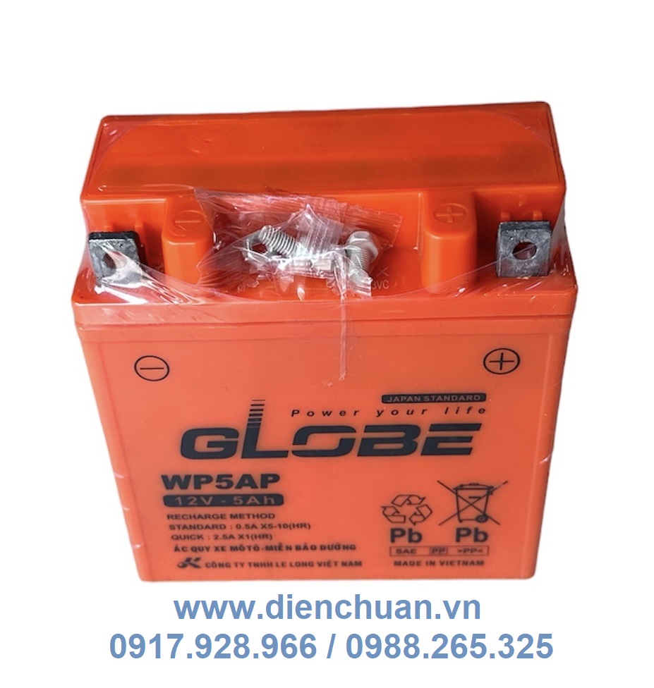 - Ắc quy Globe WP5AP 12V 5AH là ắc quy Chì thuộc dòng sản phẩm ắc quy miễn bảo dưỡng, khô, kín khí, MF - Maintenanece Free Battery sử dụng lắp đặt xe máy, motor.