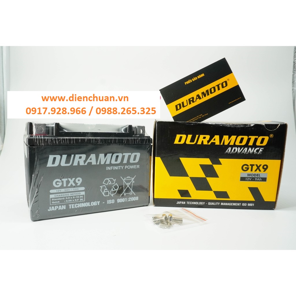 Ắc quy Duramoto GTX9 (12V 9Ah) là ắc quy khô kín khí dành cho xe máy, miễn bảo dưỡng, không cần châm nước.
