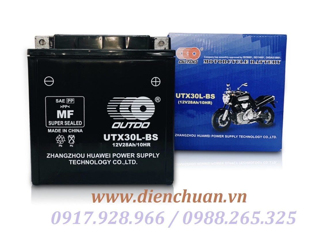 Công ty Điện Chuẩn là đại lý phân phối bán buôn bán lẻ các loại ắc quy cho xe máy moto phân khối lớn chính hãng tại Việt Nam, Ắc quy xe máy Outdo UTX30L-BS/YTX30L-BS 12V28AH/10HR) được công ty Điện Chuẩn bán tại các tỉnh Hà Nội , Bắc Ninh , Ninh Bình, Hải Phòng , Đà Nẵng, Thanh Hoá và Thành phố Hồ Chí Minh và tất cả các tỉnh thành trên cả nước với giá thành phải chăng và chế độ bảo hành chu đáo nhất