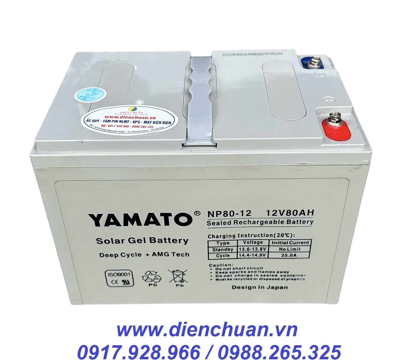 Công ty Điện Chuẩn là đơn vị bán và phân phối ắc quy Yamato chính hãng giá rẻ, uy tín trên thị trường Việt Nam , Ắc quy Yamato NP80-12 ( 12V 80AH ) dùng cho máy biến tần- kích điện- inverter, dùng lưu trữ cho nặng lượng mặt trời và đặc biệt dùng cho xe điện, tức là xe điện chạy trong nhà máy, khu công nghiệp, xe điện 3 bánh, xe điện lau sàn / trà sàn/ lau rọn rác lâu năm trên thị trường, các sản phẩm ắc quy của công ty chúng tôi bán ra là hàng mới chính hãng, giá cả phải chăng, bảo hành dài hạn, tư vấn nhiệt tình