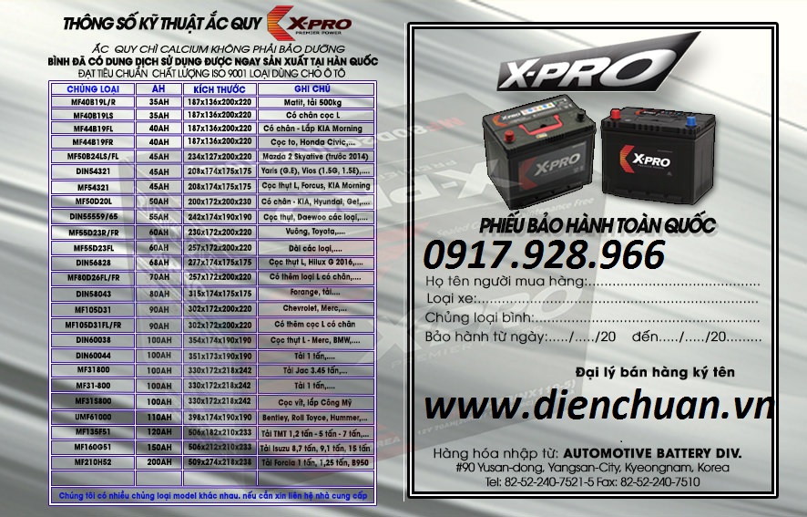 Bảng giá ắc quy X-Pro Hàn Quốc chính hãng bán lẻ tại Hà Nội