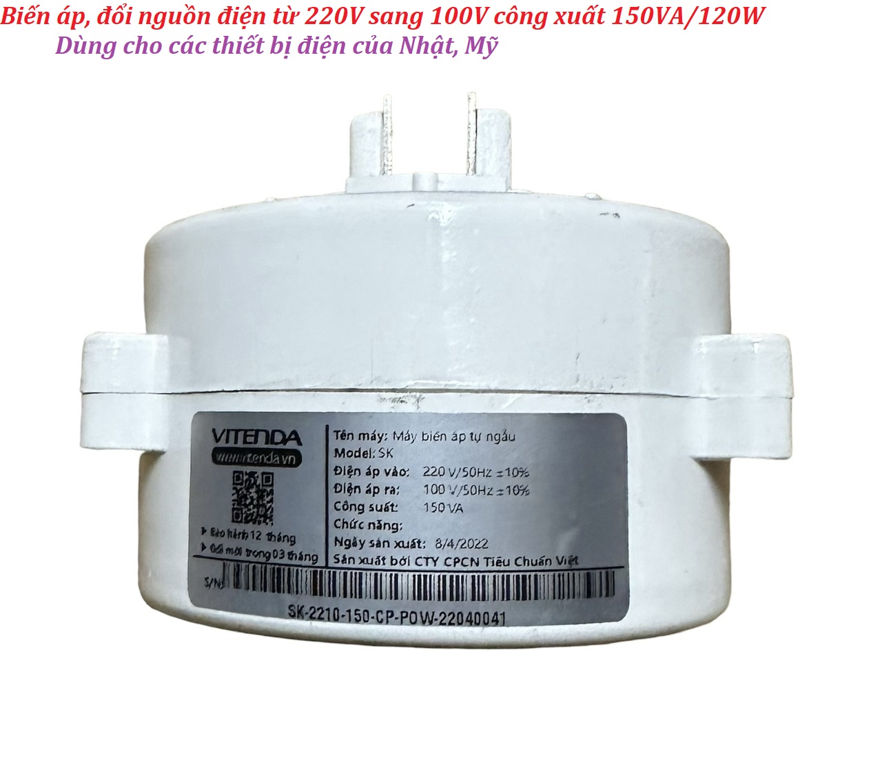 Thông số kỹ thuật của biến áp chuyển điện 220V sang 100V Vitenda công suất 150VA/ 120W: