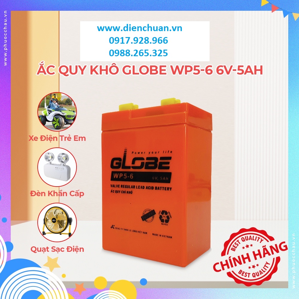 Bình ắc quy Globe 6V-5Ah WP5-6 được sản xuất tại Việt Nam bởi Công ty TNHH Le Long Việt Nam.