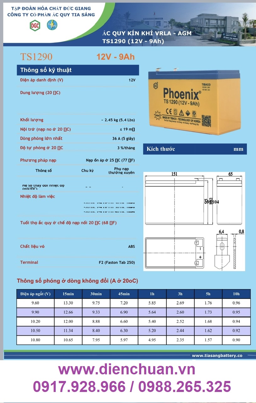 Thông số kỹ thuật ắc quy Phoenix TS1290 (12V 9Ah)
