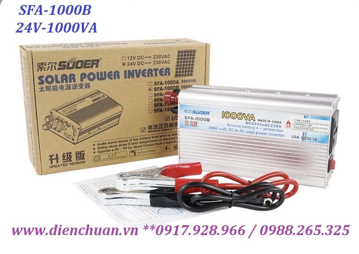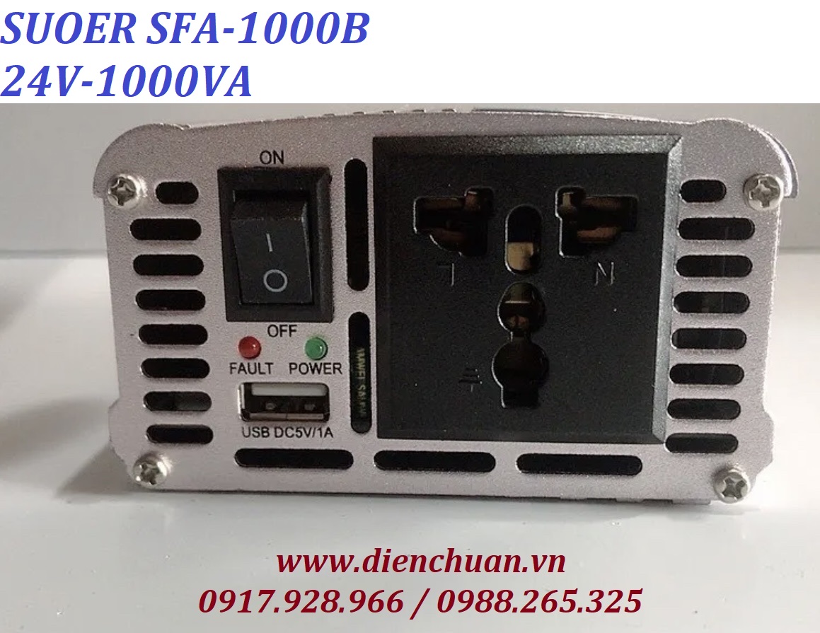 Suoer SFA-1000B . Bộ chuyển đổi kích điện ắc quy được thiết kế cực kỳ chuyên dụng cho gia đình, có thể chuyển đổi điện áp từ ắc quy 24V sang điện áp AC 220V / 230V và hoạt động trên hầu hết các thiết bị điện trở trong gia đình như máy nghe nhạc MP3, Máy tính xách tay, ánh sáng khẩn cấp, chăn điện, máy cạo râu điện, nồi cơm điện, máy ảnh kỹ thuật số, video kỹ thuật số, đầu đĩa CD / DVD, trình chơi game XBOX / PS4, đèn điện thông thường, bóng đèn, đèn huỳnh quang, nồi cơm điện, , Máy fax, máy in, LCD TV, quạt điện, sạc điện thoại di động, sắt điện, vòi phun nước uống, máy sấy tóc và như vậy