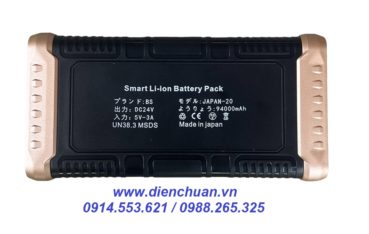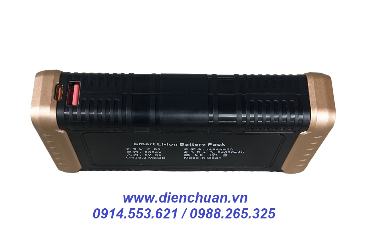 Pin Li-ion hệ 24V dung lượng cao 94000mAh , pin có đường ra là lỗ cắm chân tròn chạy quạt, 2 cống usb type C và type A .