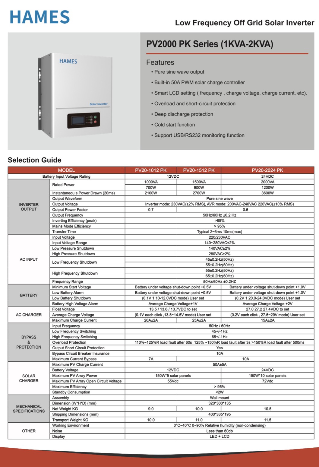 Kích điện Inverter Hybrid Hames 2000VA 24V có sạc pin Solar 50A, sạc điện lưới AC 15A ( OFF Grid Solar Inverter)