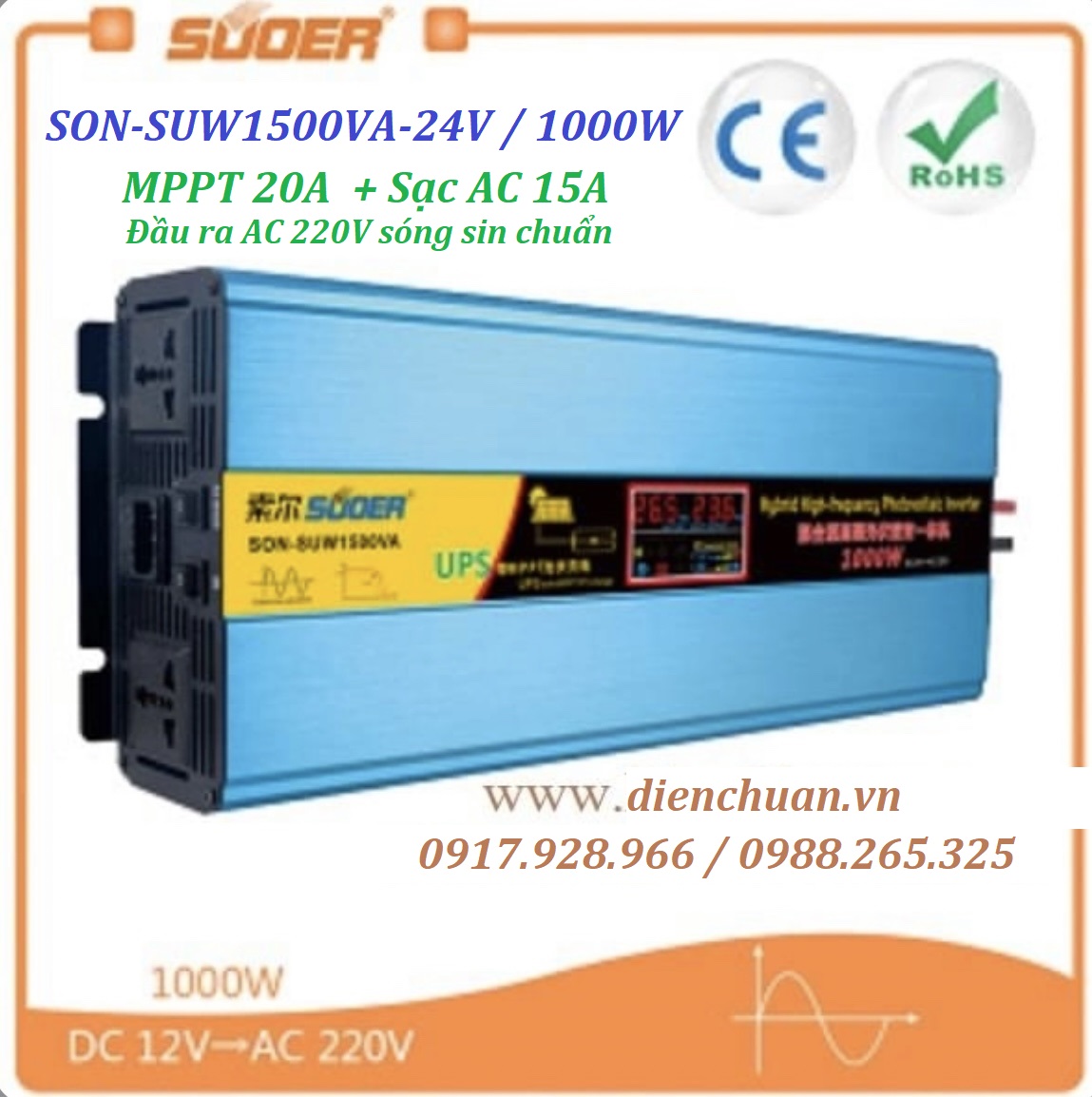 Công ty Điện Chuẩn chuyên cung cấp các sản phẩm inverter- kích điện Suoer chính hãng giá rẻ . Kích điện Suoer 24V 1500VA SON-SUW1500VA ( Inverter Solar Suoer 1500VA/1000W 24V ) được công ty Điện Chuẩn bán tại các tỉnh Hà Nội , Bắc Ninh , Ninh Bình , Nam Định, Ninh Bình,Hải Phòng , Đà Nẵng , Thanh Hoá và Thành phố Hồ Chí Minh và tất cả các tỉnh thành trên cả nước với giá thành hợp lý phải chăng và chế độ bảo hành chu đáo nhất
