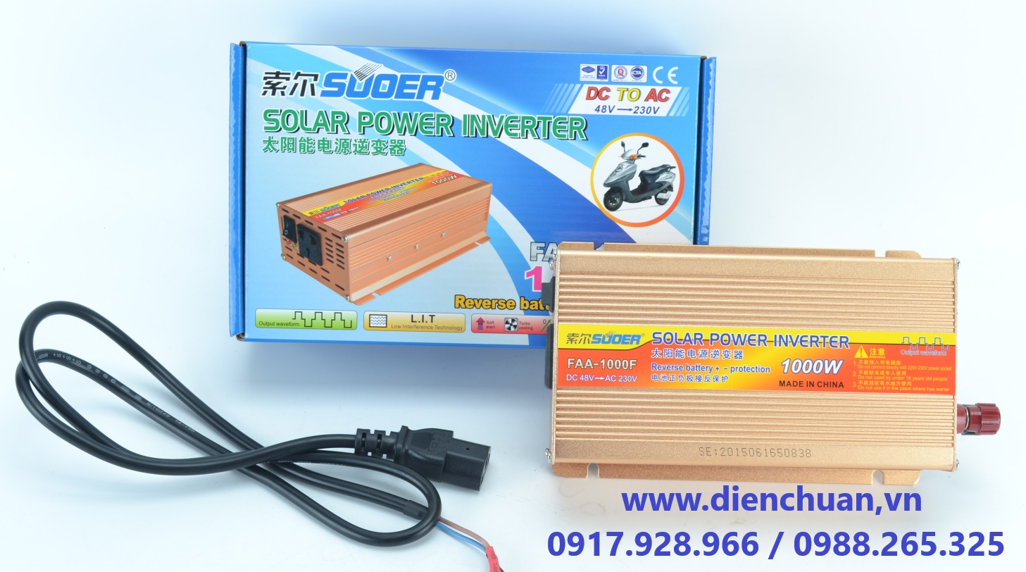 Công ty Điện Chuẩn là Đại Lý phân phối Máy kích điện chạy ắc quy DC 48V lên 220V AC công suất 1000W, model: SUOER FAA-1000F tại thị trường Việt Nam, công ty chúng tôi kinh doanh phân phối bình ắc quy, inverter - kích điện- Biến tần, tấm pin năng lượng mặt trời, quạt ắc quy 12V DC/ quạt năng lượng mặt trời lâu năm trên thị trường, các sản phẩm của công ty chúng tôi bán ra là hàng mới chính hãng, giá cả phải chăng, bảo hành dài hạn, tư vấn nhiệt tình.