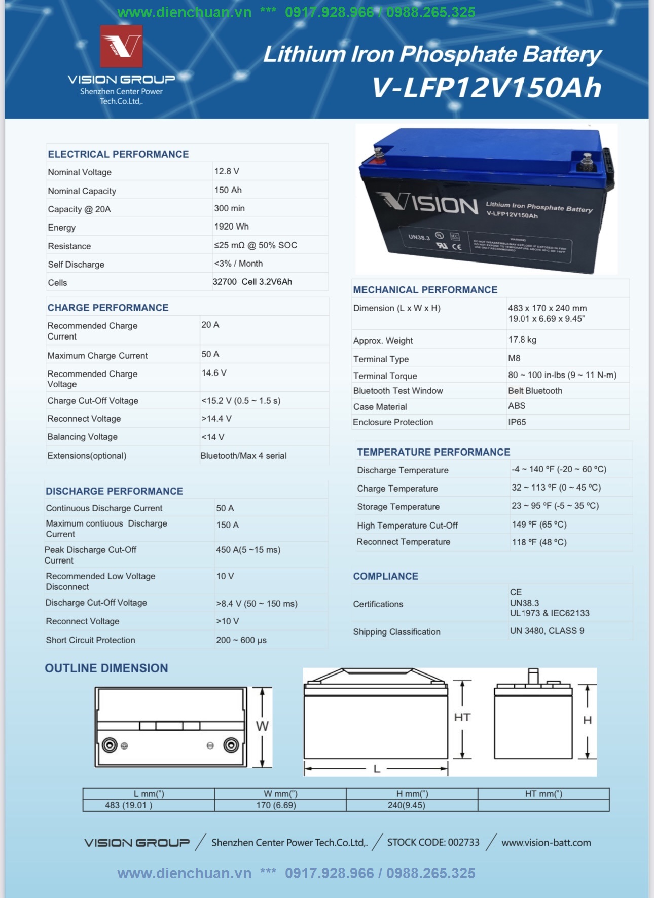 Công ty Điện Chuẩn được khách hàng đánh giá cao về chất lượng hàng hóa cũng như phân phối tất cả các bình ắc uy của các nhà sản xuất khác nhau, trong đó có Pin Lithium Vision 12V-150Ah ( V-LFP12V150Ah) hàng chính hãng, giá tốt. Nhận hàng với giá cả hợp lý nhất và giao hàng tận nơi trên toàn quốc sẽ làm hài lòng mọi khách hàng khó tính nhất.