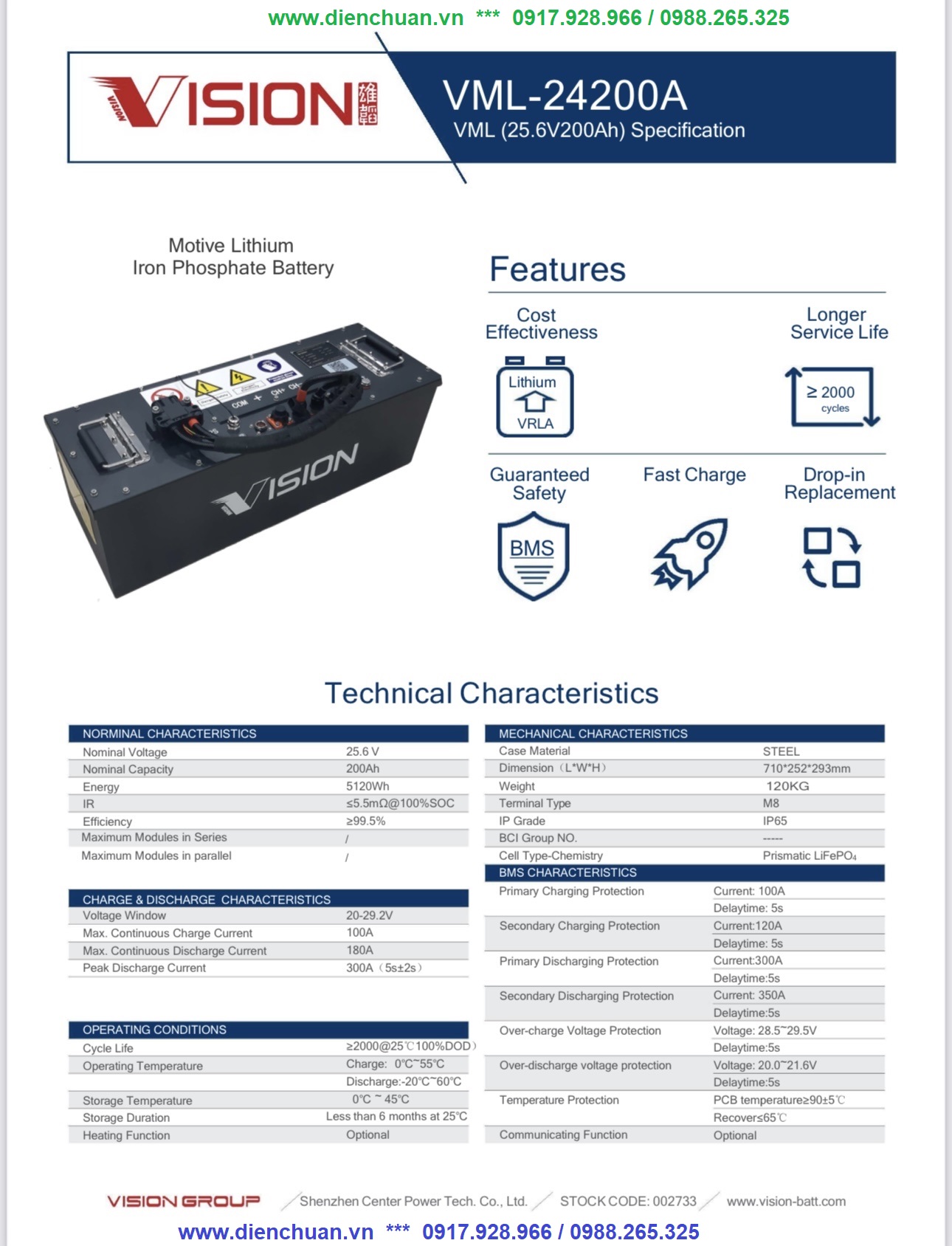 Pin Lithium Vision 24V-200Ah ( VML-24200Ah)- VML-25.6V200Ah/ pin sắt phophaste/ Lifepo4 iron 24V-200ah Vision chuyên dùng cho điện nâng hạ