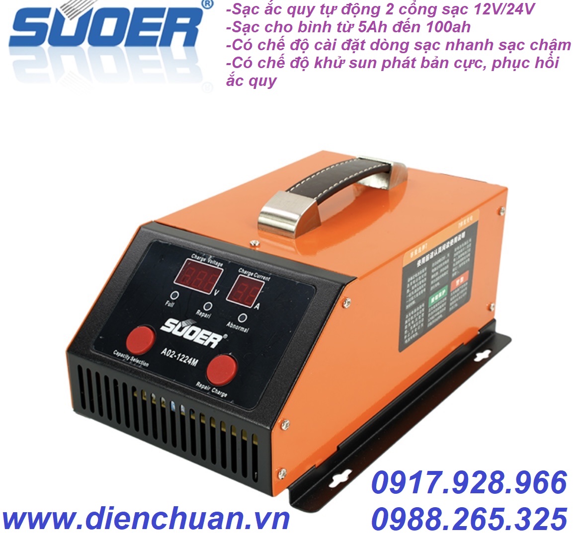 Máy sạc ắc quy Suoer A02-1224M ( 12V/24V 10A/ 5Ah-100Ah ) được sử dụng để nạp tự động cho tất cả các loại bình ắc quy có mặt trên thị trường như bình ắc quy nước, bình ắc quy khô, bình ắc quy xe máy, ắc quy ô tô, các loại bình ắc quy lắp cho máy lưu điện UPS, bình ắc quy viễn thông và đặc biệt phù hợp để nạp duy trì cho các loại bình ắc quy lắp cho máy phát điện .... .....