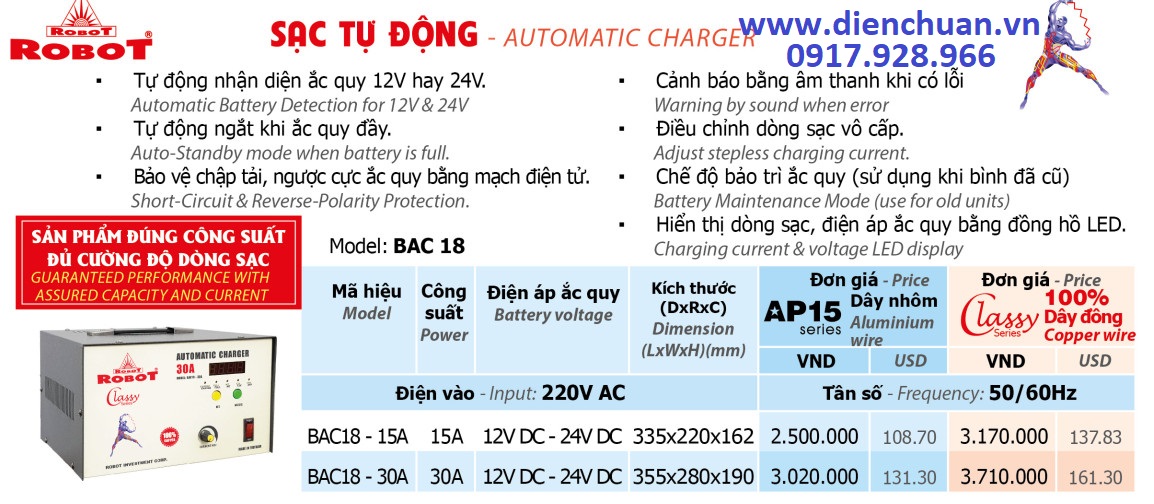 Sạc ắc quy tự động Robot 30A BAC18-30A